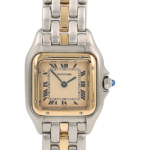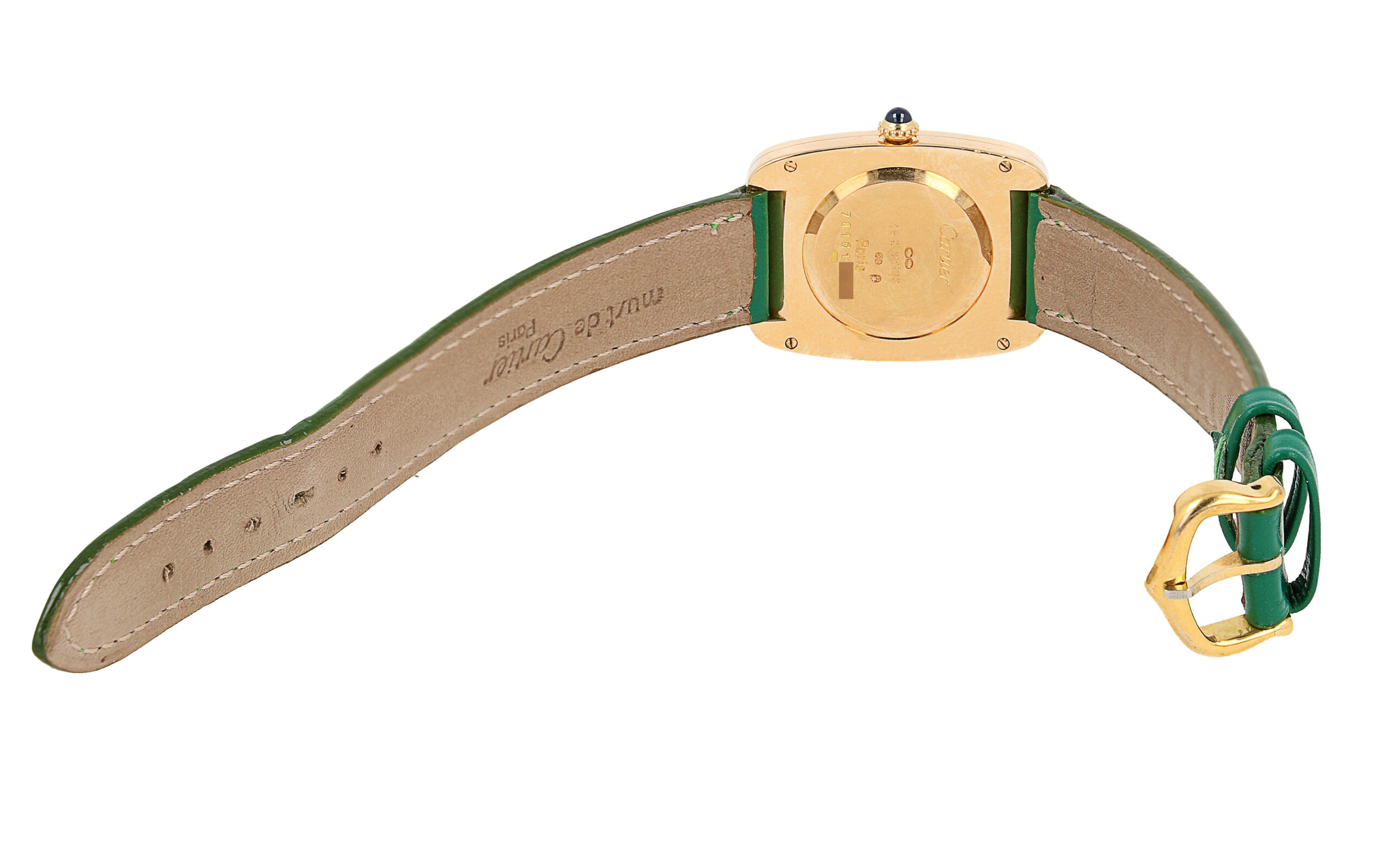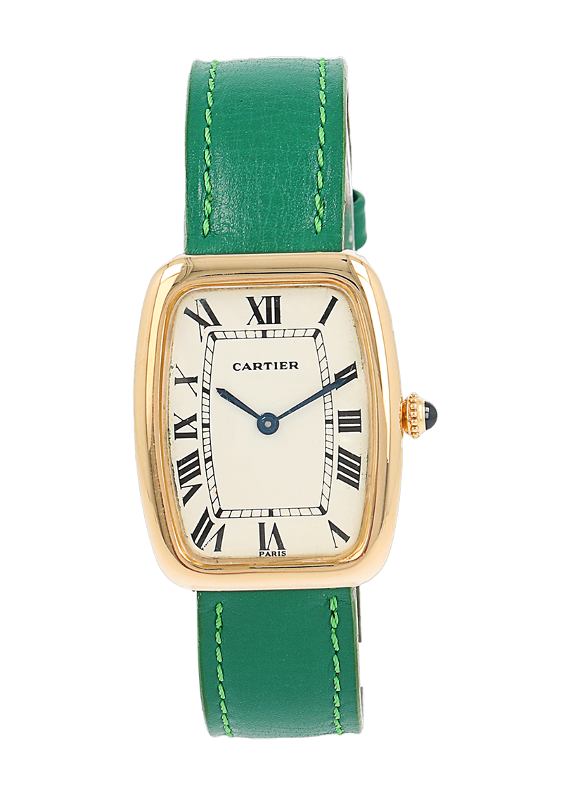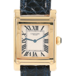 Cartier Fabergé Paris in oro giallo 18 kt, referenza 78101, con cassa rettangolare da 26×33 mm, caratterizzato dall’iconico quadrante con numeri romani e lancette in acciaio azzurrato. Il quadrante color avorio, firmato “Cartier Paris”, è incorniciato da una lunetta lucida e sormontato da una corona in zaffiro cabochon, inconfondibile segno distintivo di Cartier. Movimento a carica manuale, un classico esempio della raffinata tradizione orologiera parigina. Anni ’70