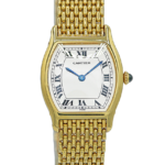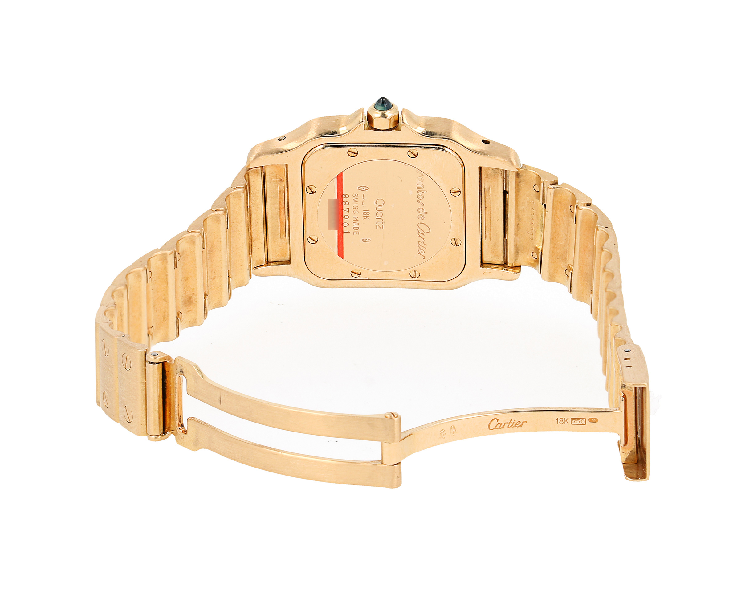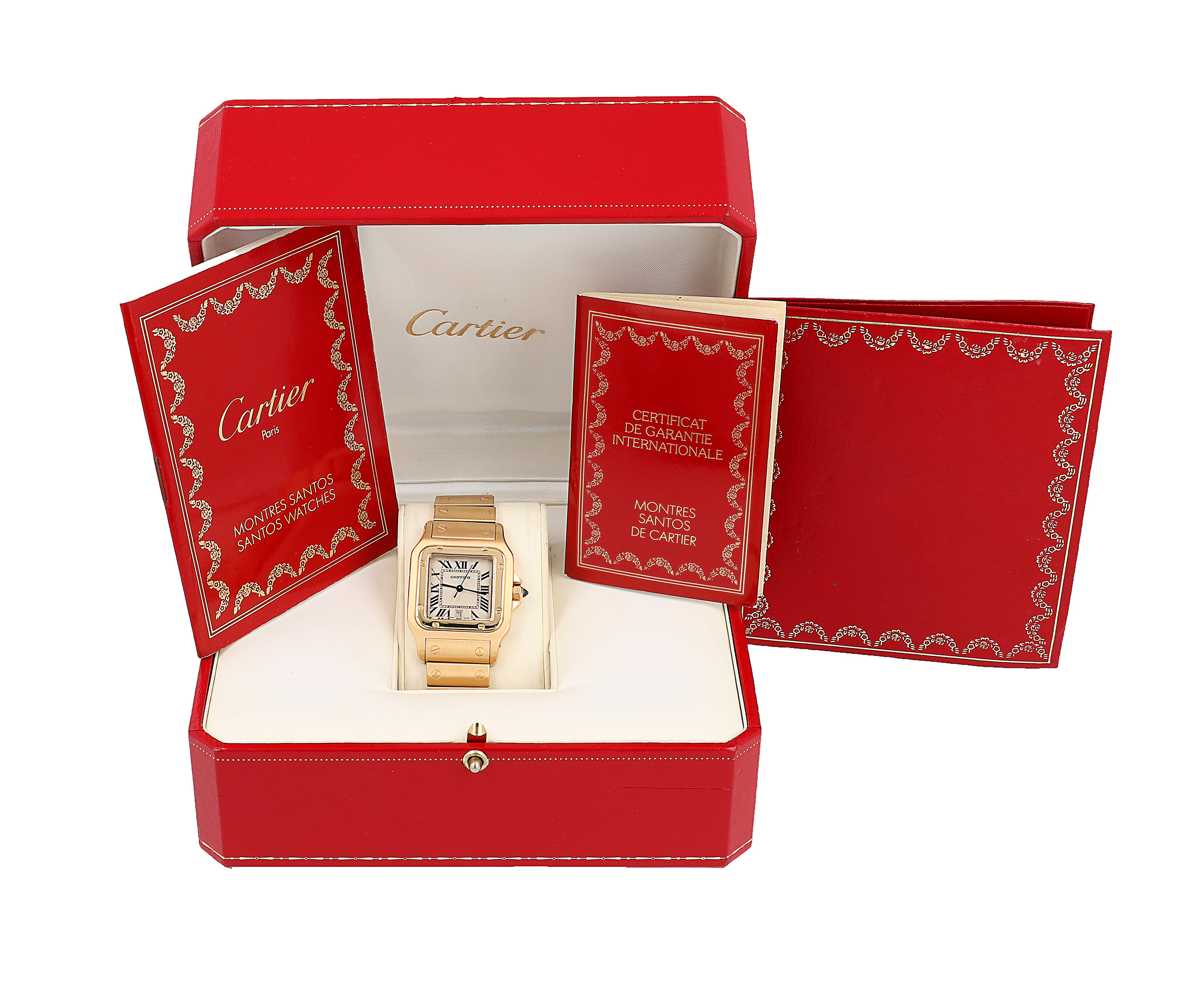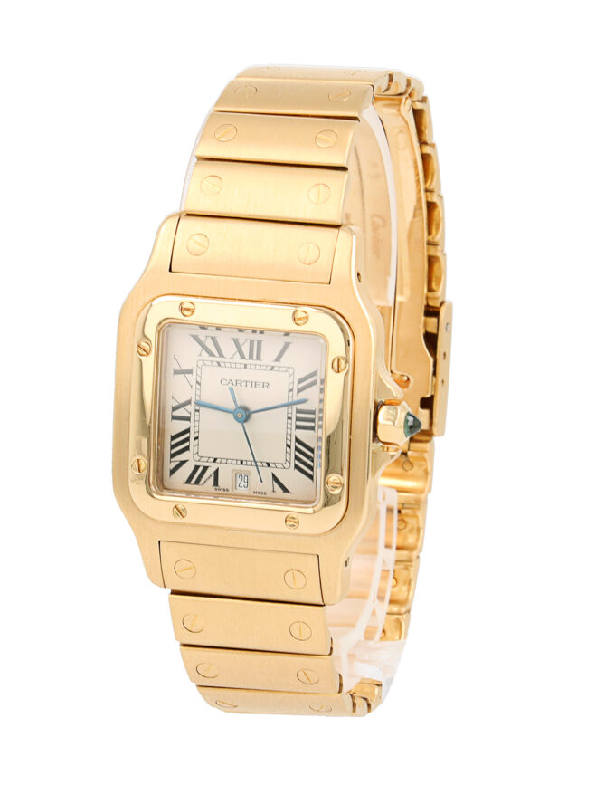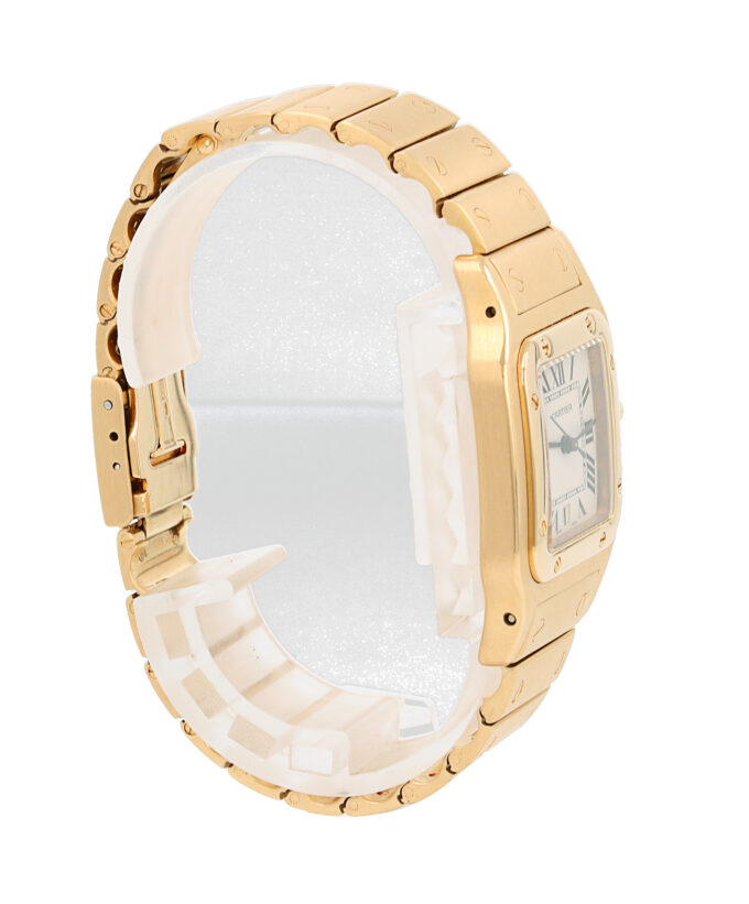 CartierCartier Santos Galbèe in oro giallo 18kt, referenza 887901, quadrante bianco crema con indici romani, movimento al Quarzo. Anni ’90 con scatola e garanzia. 29x29mm.