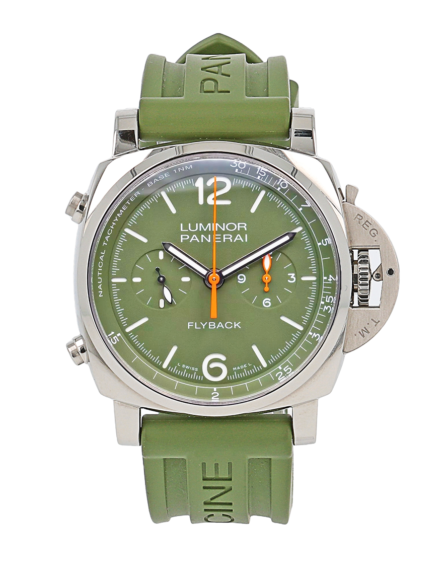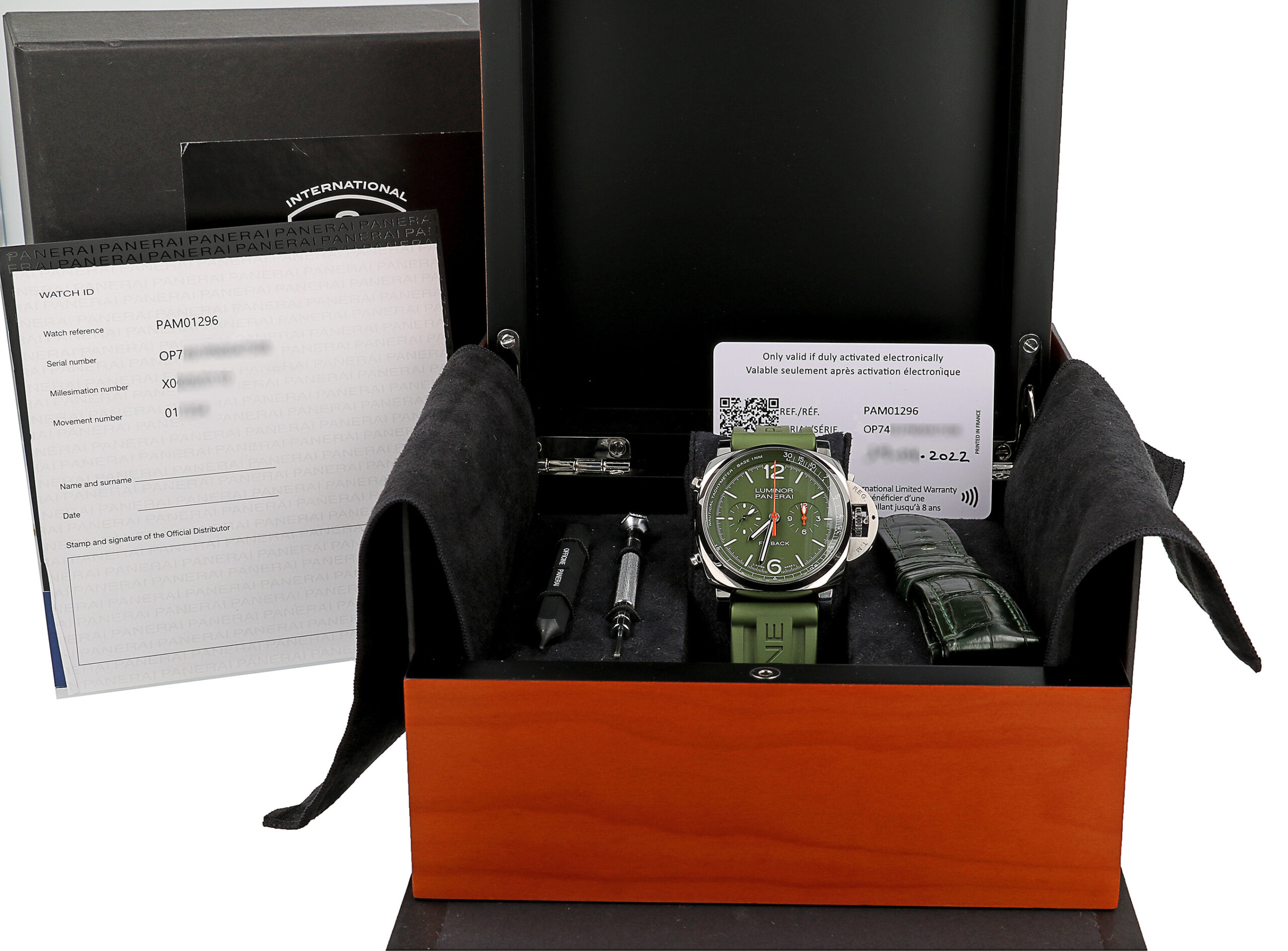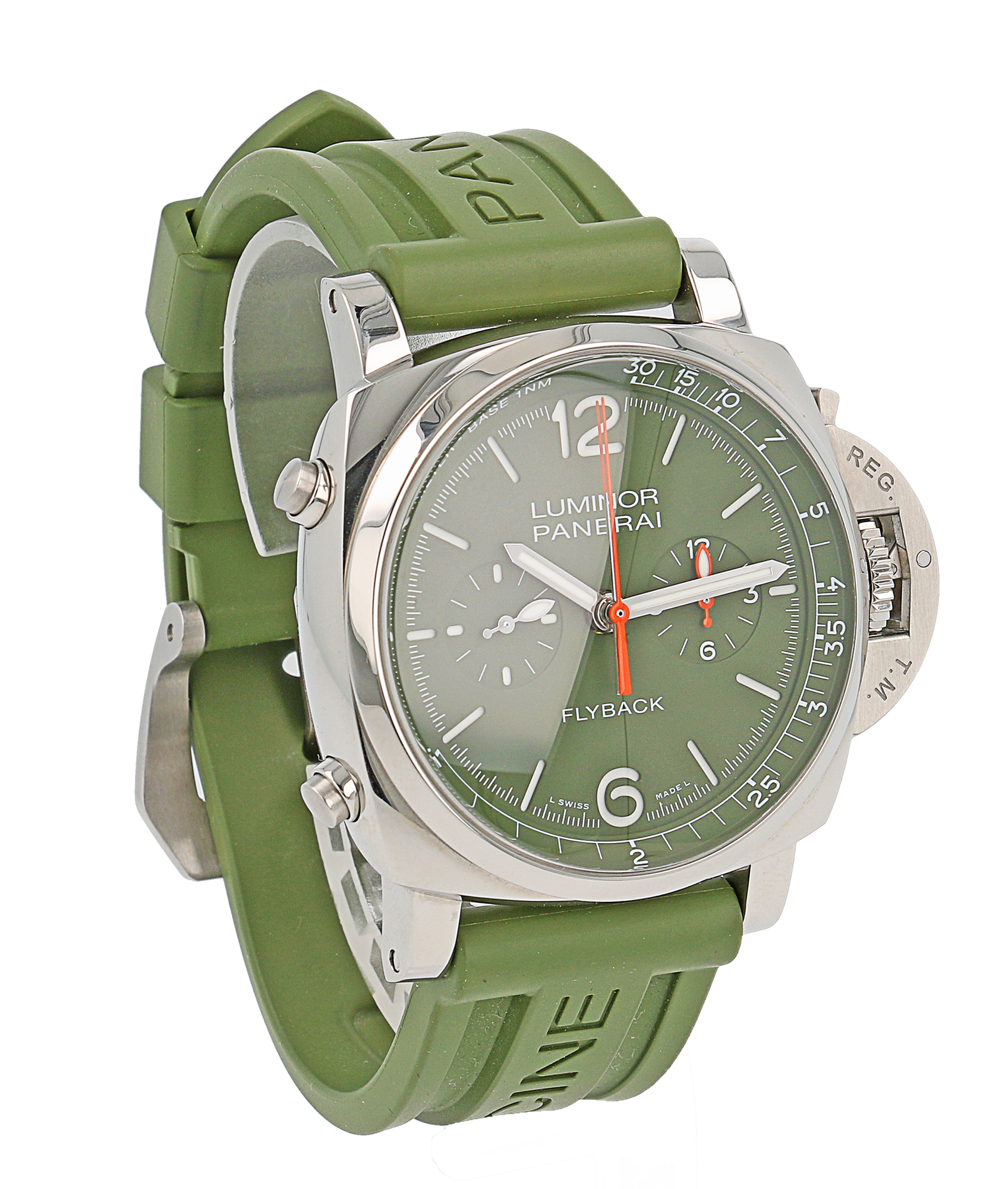 Panerai Luminor Chrono Flyback Verde Militare Edizione Limitata, referenza PAM01296. Orologio da polso cronografo automatico a carica automatica con cassa a cuscino da 44 mm in acciaio inossidabile spazzolato e lunetta lucida. Presenta un quadrante verde militare con numeri arabi luminescenti, indici e scala tachimetrica, oltre a due quadranti secondari: contatore dei 30 minuti a ore 3 e piccoli secondi a ore 9. Il proteggi corona brevettato Panerai e il vetro zaffiro antigraffio antiriflesso completano il modello. Completano il modello un cinturino in caucciù verde e una fibbia ad ardiglione in acciaio inossidabile. 2022, in perfette condizioni, Full-set.