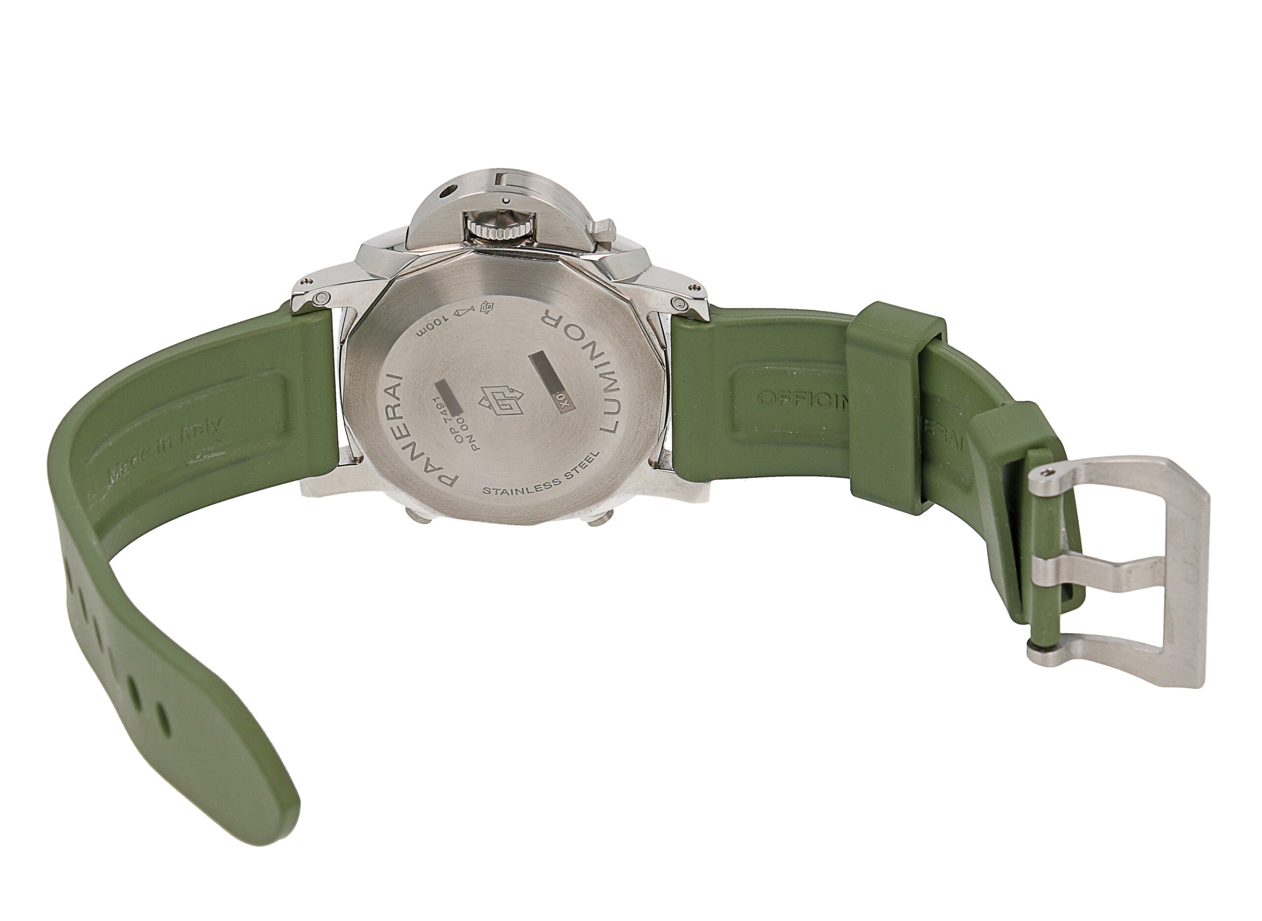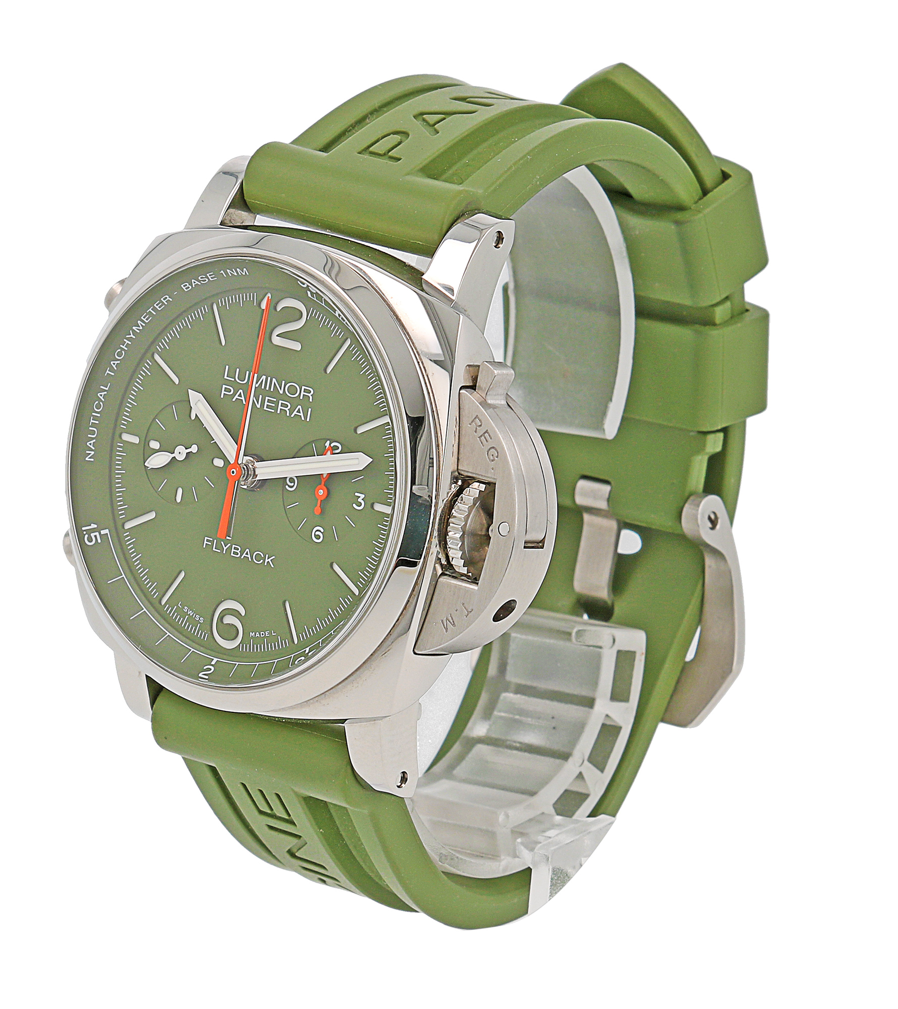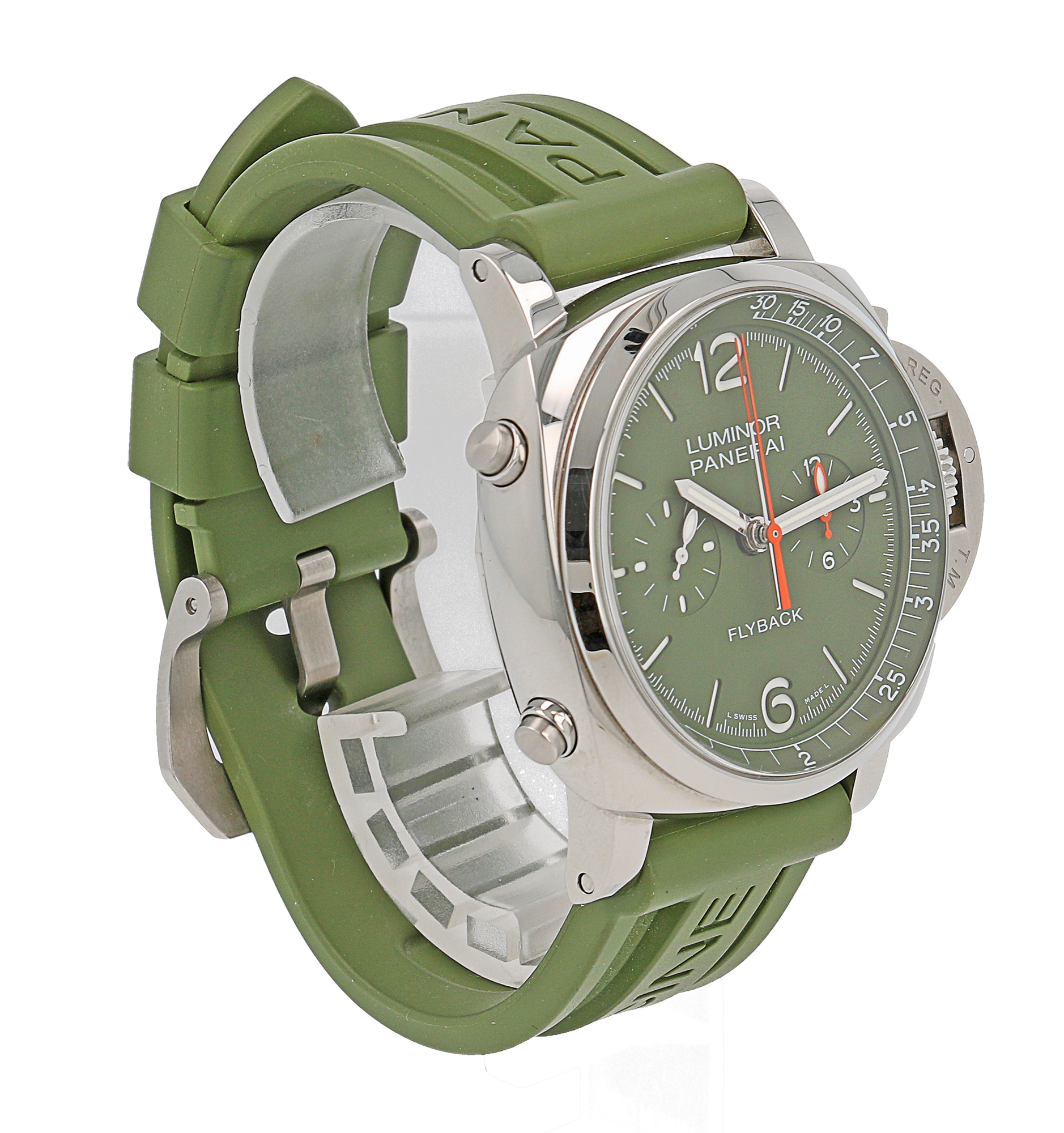 Panerai Luminor Chrono Flyback Verde Militare Edizione Limitata, referenza PAM01296. Orologio da polso cronografo automatico a carica automatica con cassa a cuscino da 44 mm in acciaio inossidabile spazzolato e lunetta lucida. Presenta un quadrante verde militare con numeri arabi luminescenti, indici e scala tachimetrica, oltre a due quadranti secondari: contatore dei 30 minuti a ore 3 e piccoli secondi a ore 9. Il proteggi corona brevettato Panerai e il vetro zaffiro antigraffio antiriflesso completano il modello. Completano il modello un cinturino in caucciù verde e una fibbia ad ardiglione in acciaio inossidabile. 2022, in perfette condizioni, Full-set.