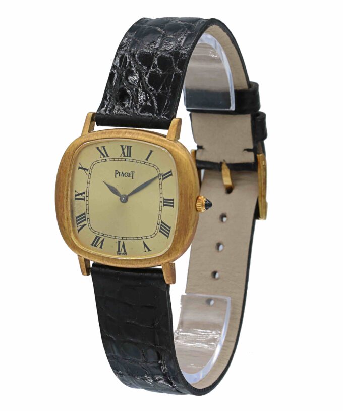 Piaget Lady in oro giallo 18kt, referenza 9453, quadrante champagne con numeri romani, vetro plexi, movimento meccanico a carica manuale. Anni ’70 con scatola e garanzia originale.