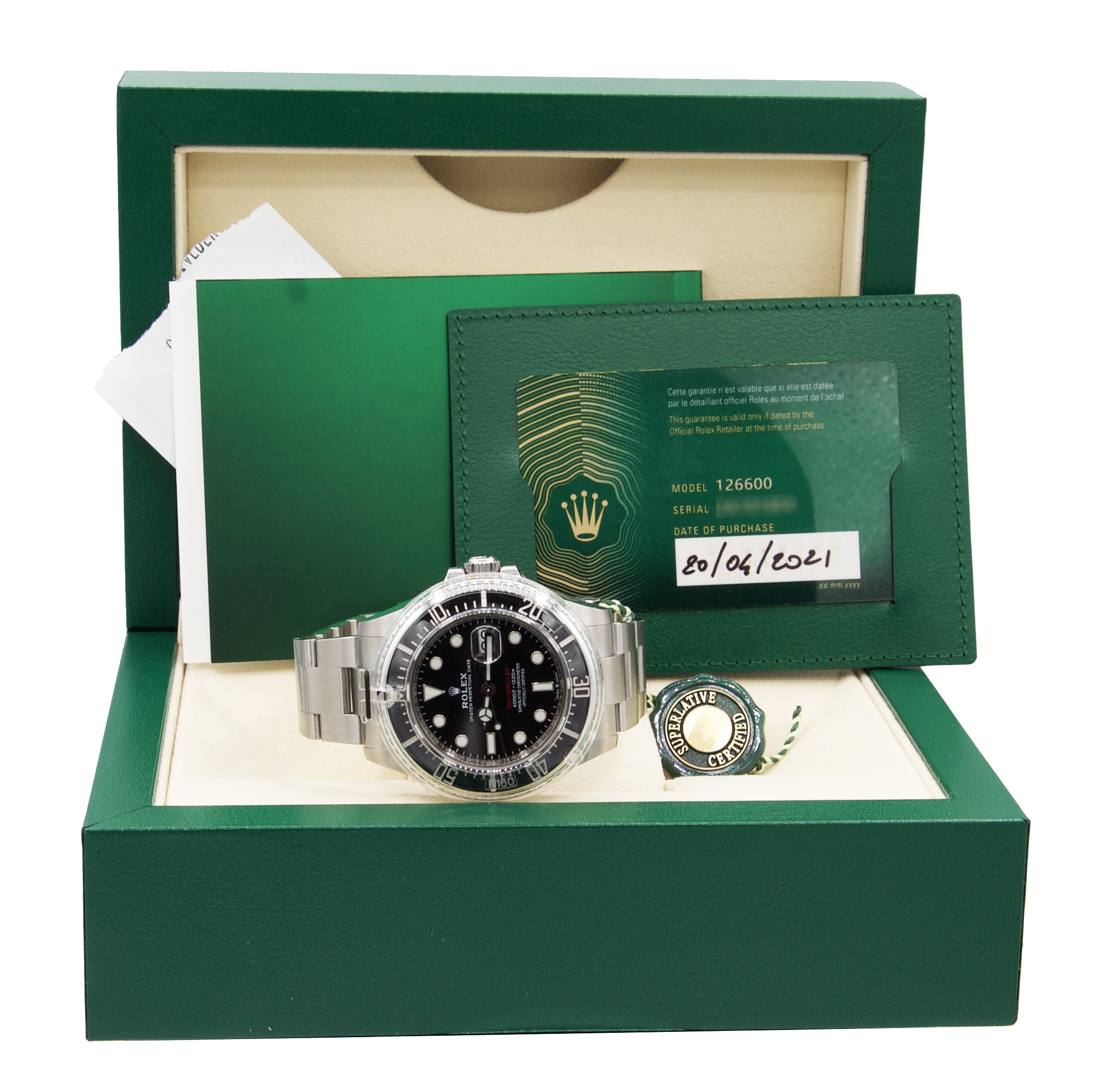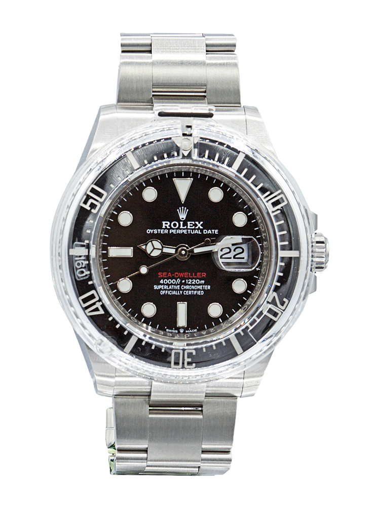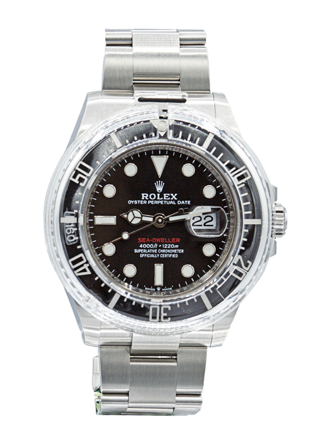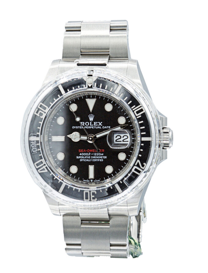 Rolex Sea-Dweller Date in acciaio, referenza 126600, quadrante nero con scritta rossa, indici applicati e data ad ore 3, fondello e corona a vite, movimento meccanico a carica automatica. Completo di scatola e garanzia. Anni ‘2000.