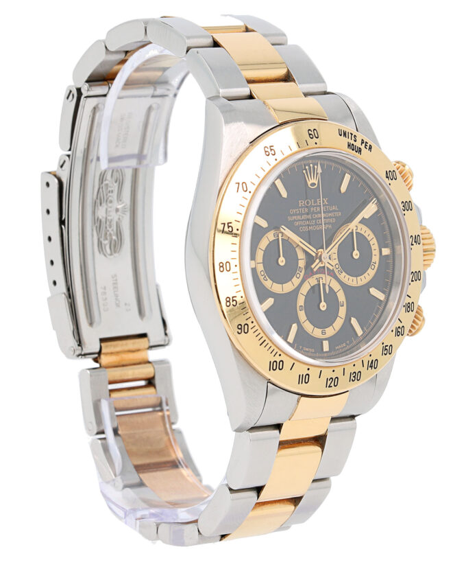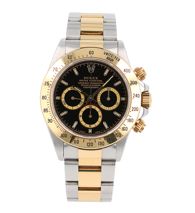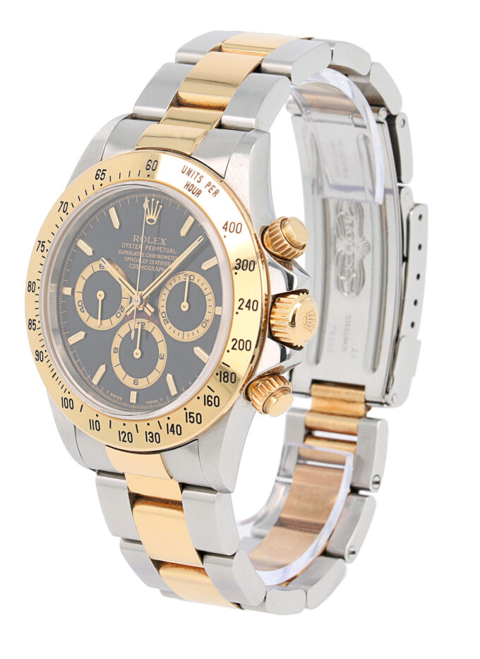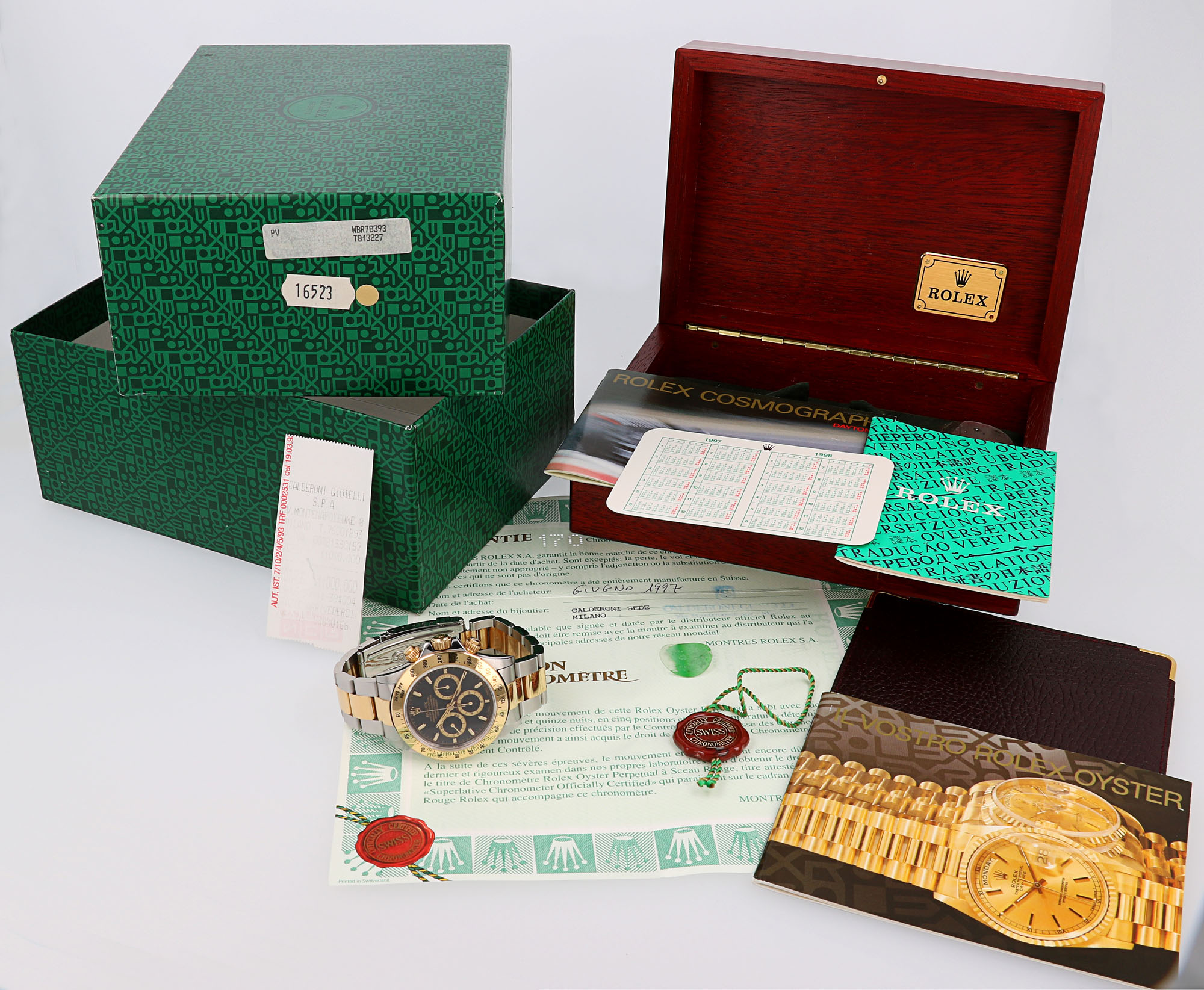 RolexRolex Cosmograph Daytona in acciaio ed oro giallo 18ct, referenza 16523, quadrante nero con indici applicati, fondello, tasti e corona a vite, movimento meccanico Zenith a carica automatica. Completo di scatola, controscatola, garanzia, libretti e scontrino d’acquisto dell’epoca. Anni ’90.