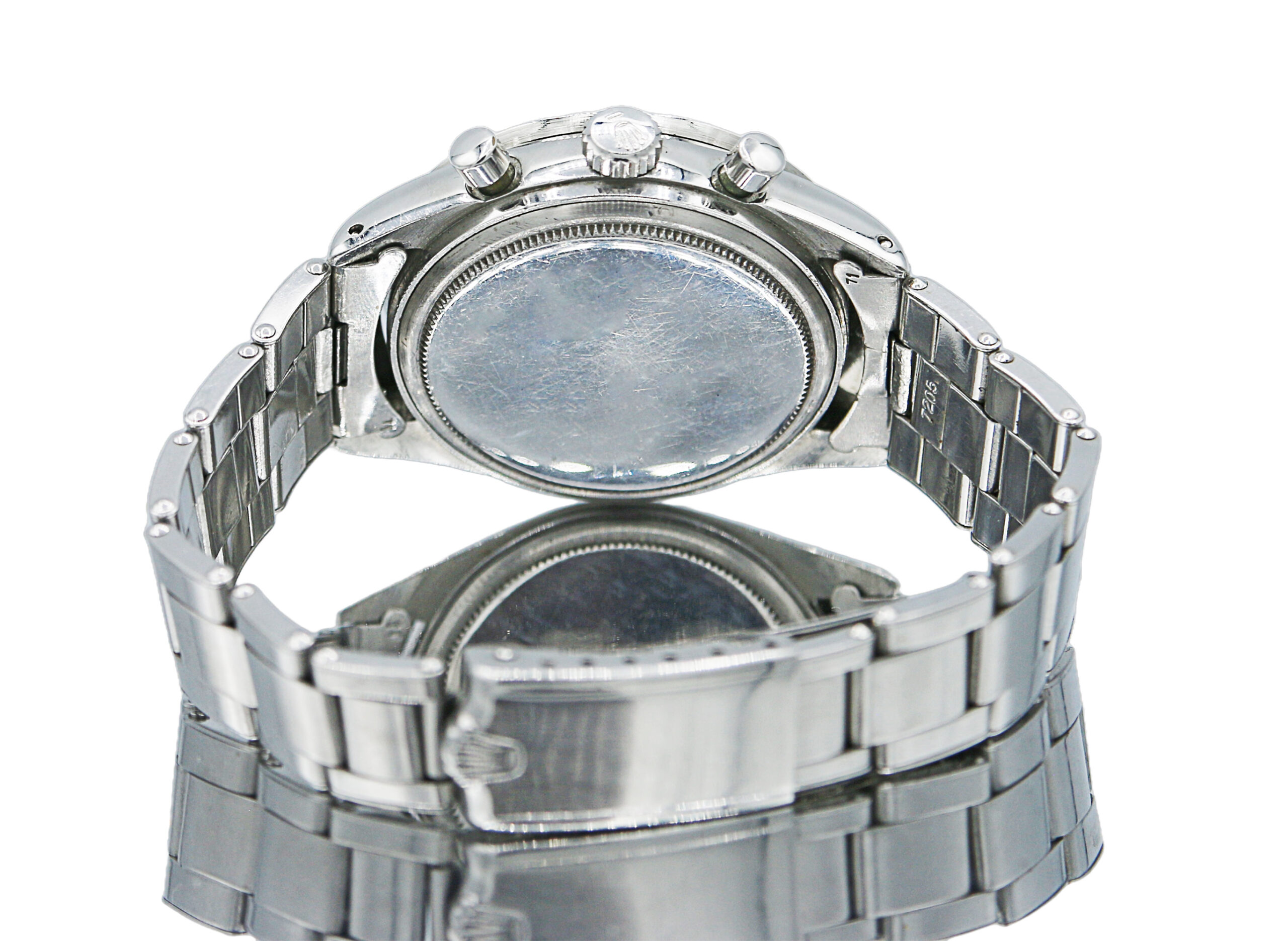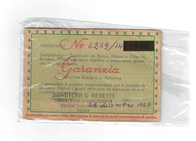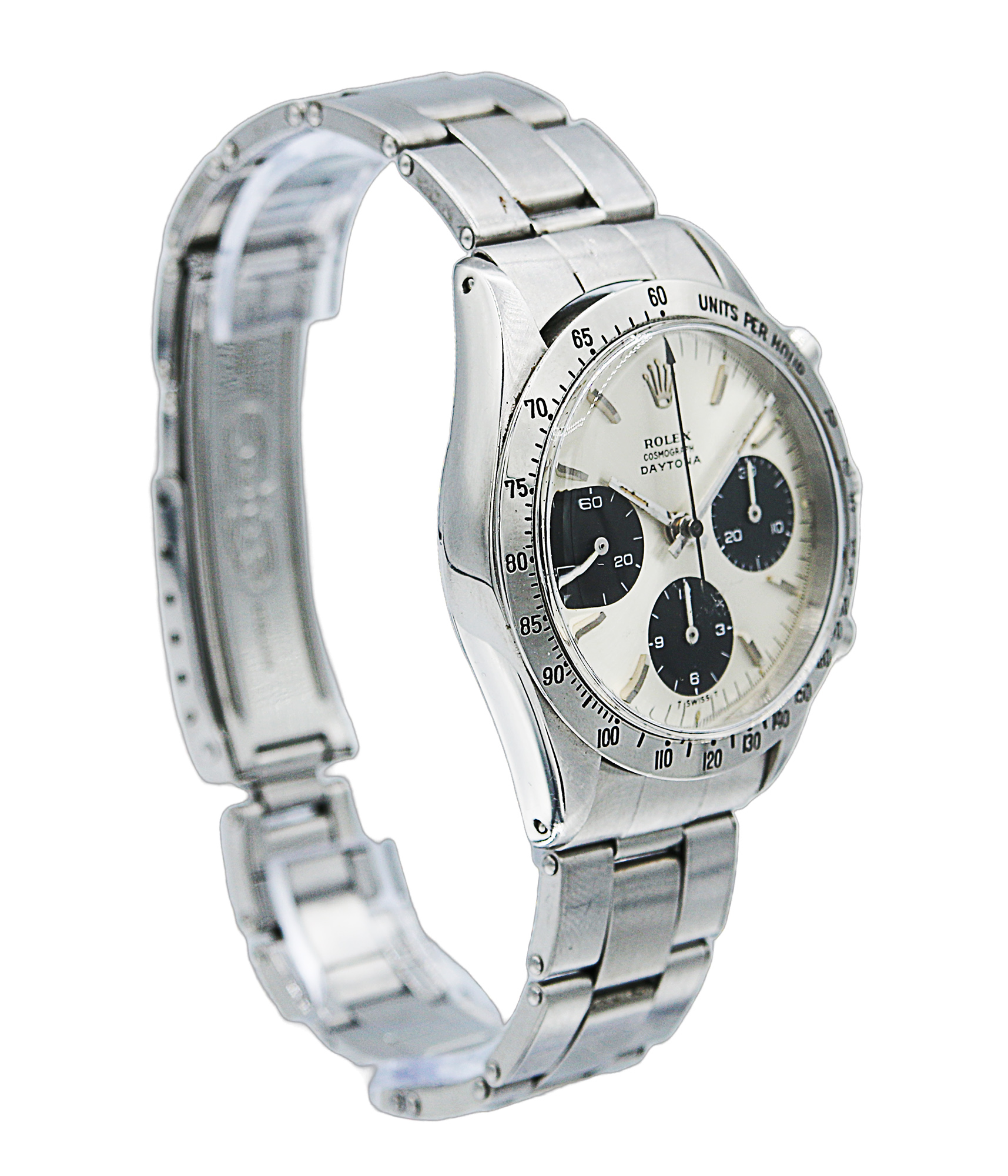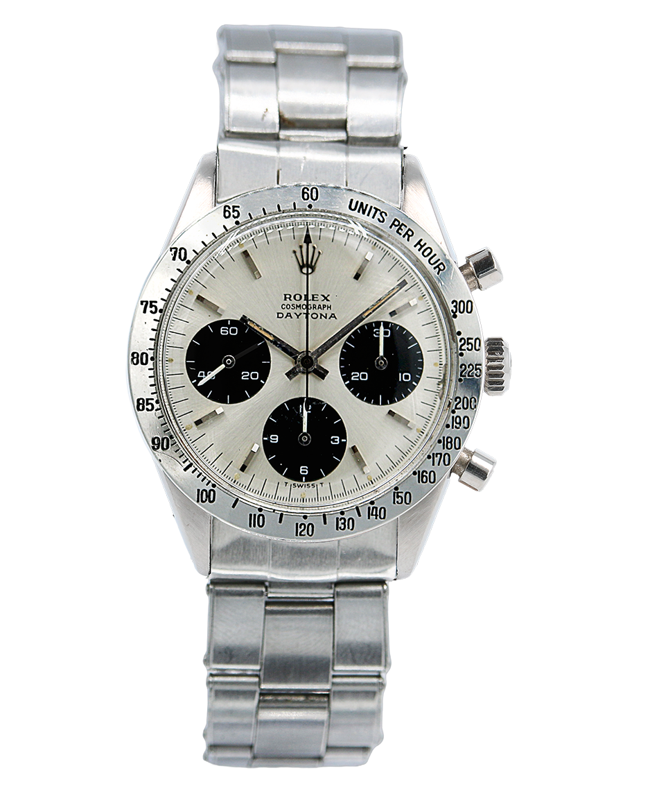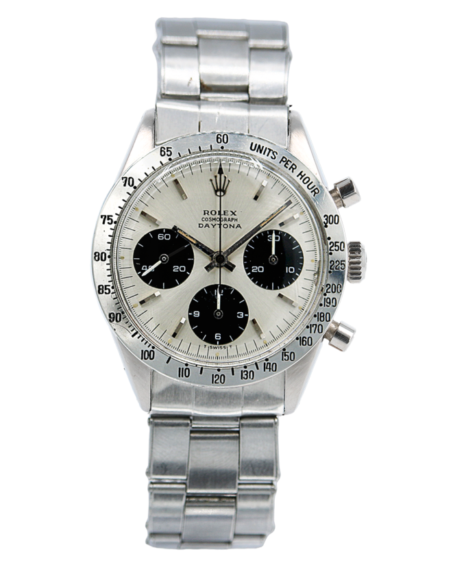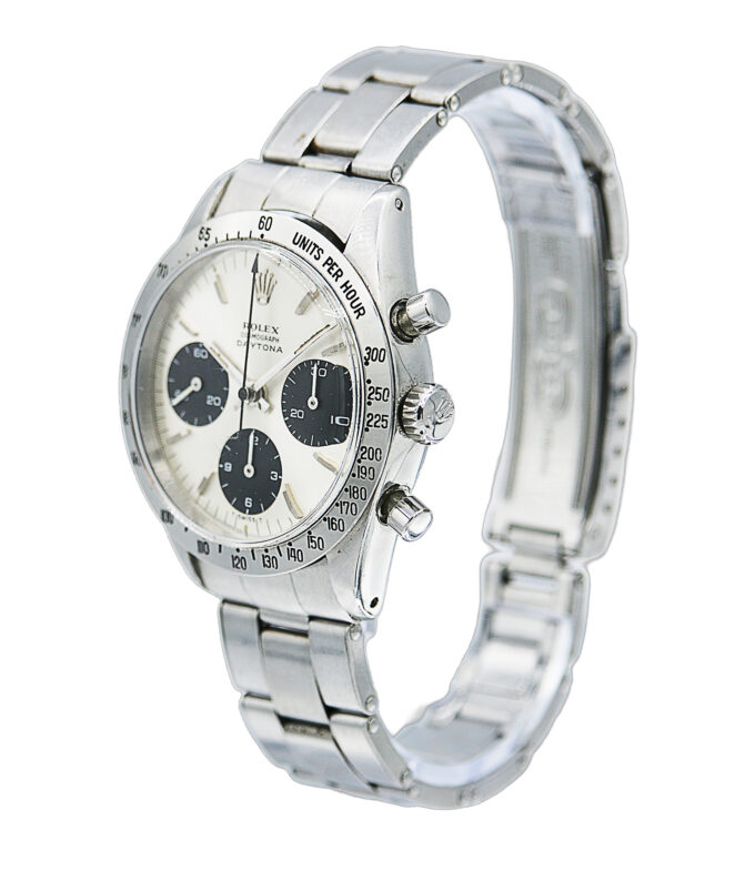 Rolex Cosmograph Daytona in acciaio, referenza 6239, quadrante argentè con indici applicati, fondello, tasti e corona a vite, movimento a carica manuale, con garanzia dell’epoca. Anno 1966.
