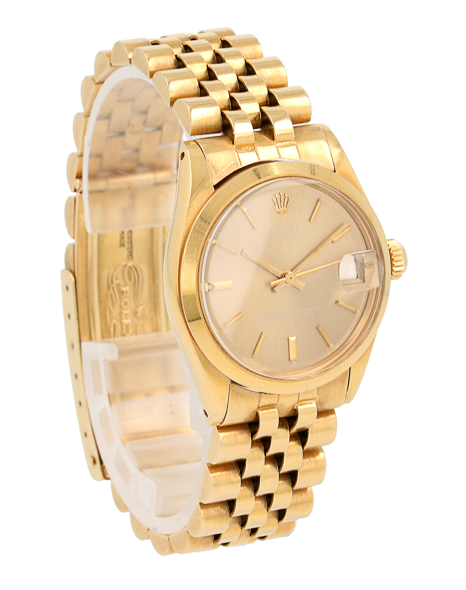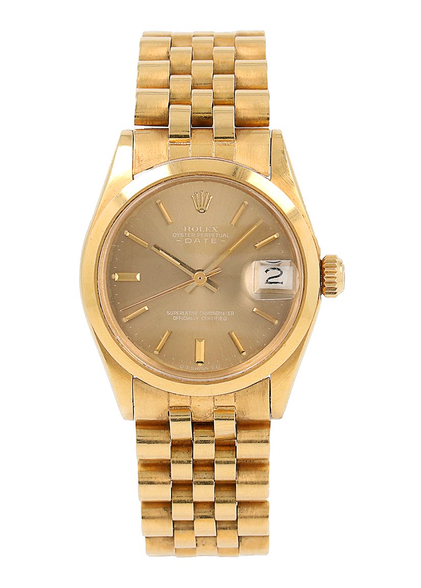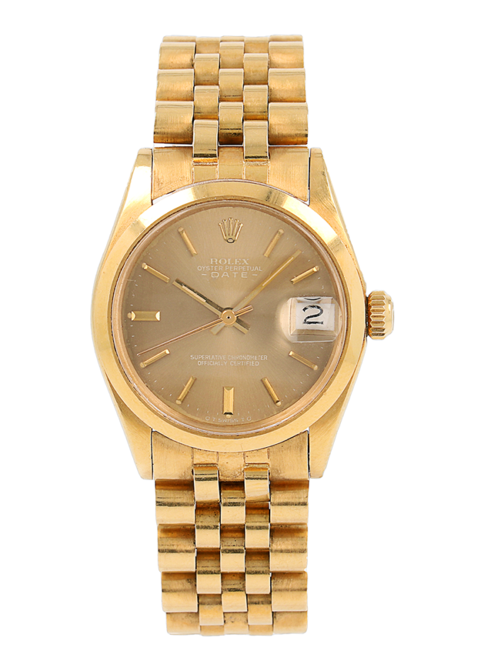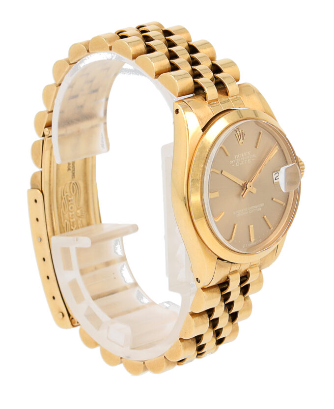 Rolex Oyster Perpetual Date in oro giallo, referenza 6824, quadrante Marrone “Ghost” con indici applicati e data ad ore 3, fondello e corona a vite, movimento meccanico a carica automatica. 3.9M, anno 1975. 31mm.