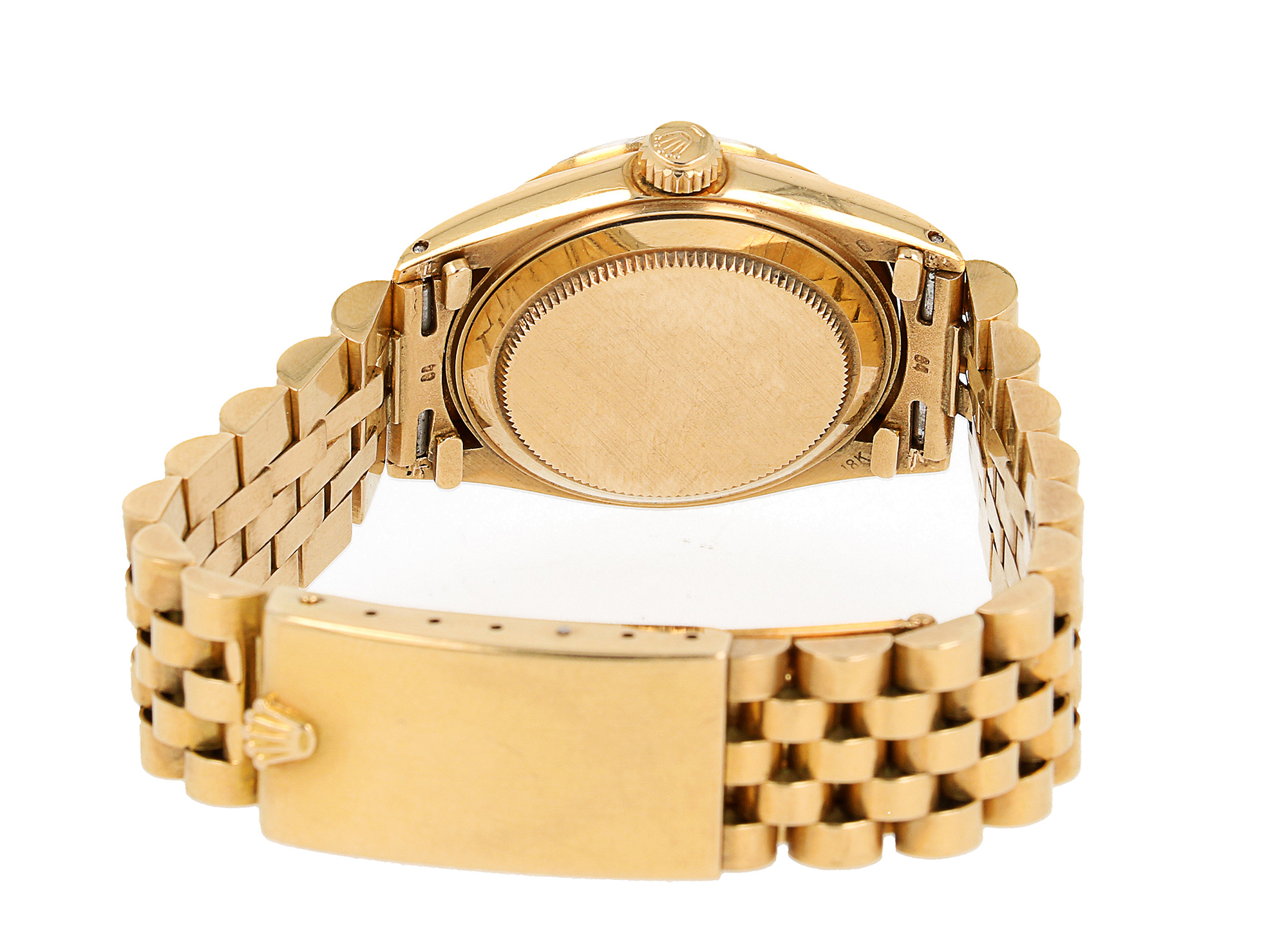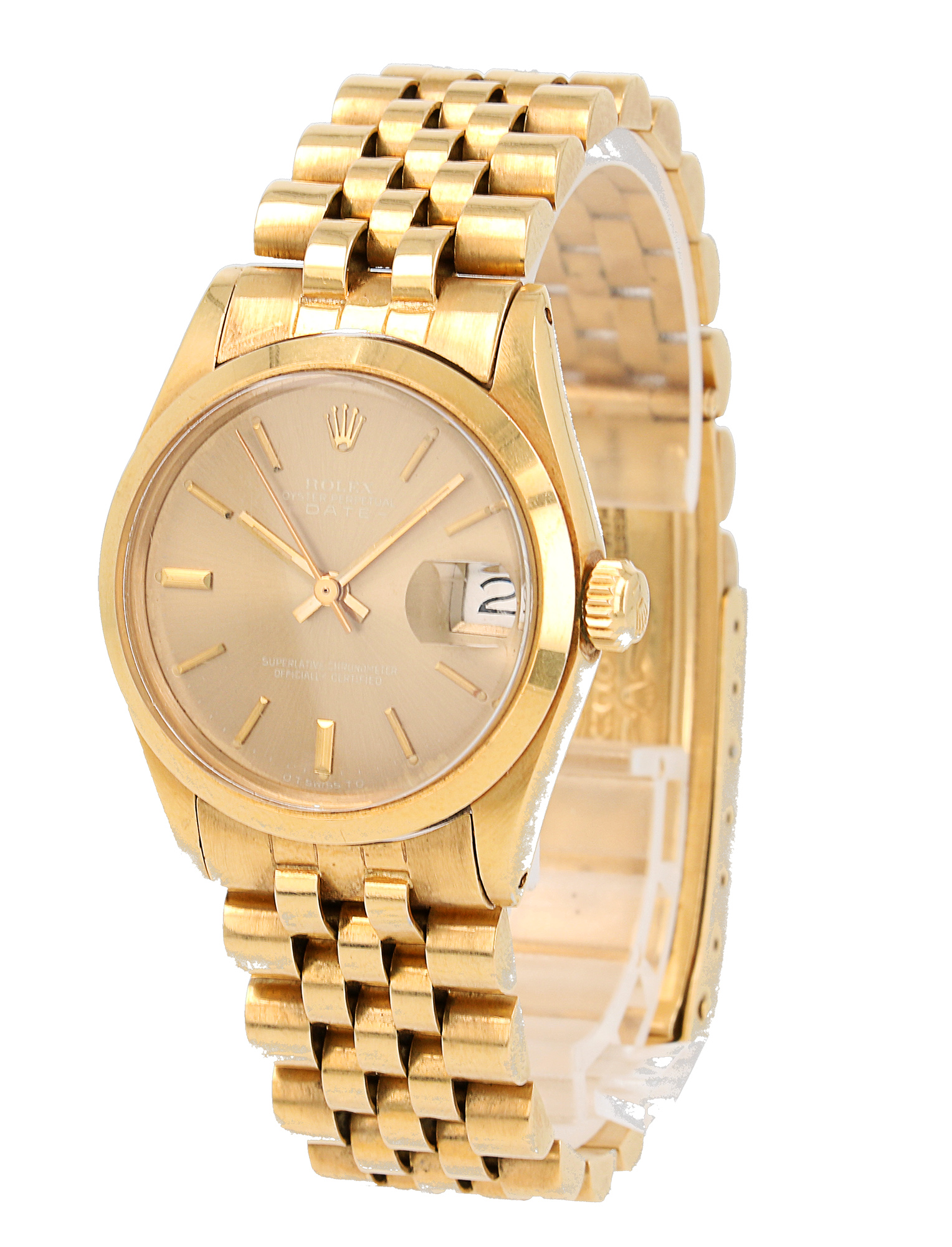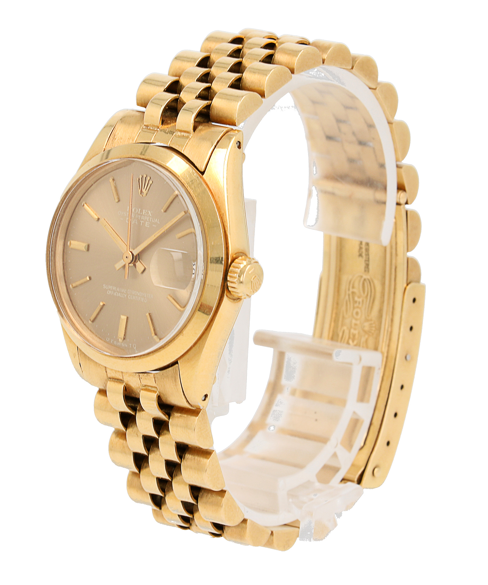 Rolex Oyster Perpetual Date in oro giallo, referenza 6824, quadrante Marrone “Ghost” con indici applicati e data ad ore 3, fondello e corona a vite, movimento meccanico a carica automatica. 3.9M, anno 1975. 31mm.