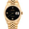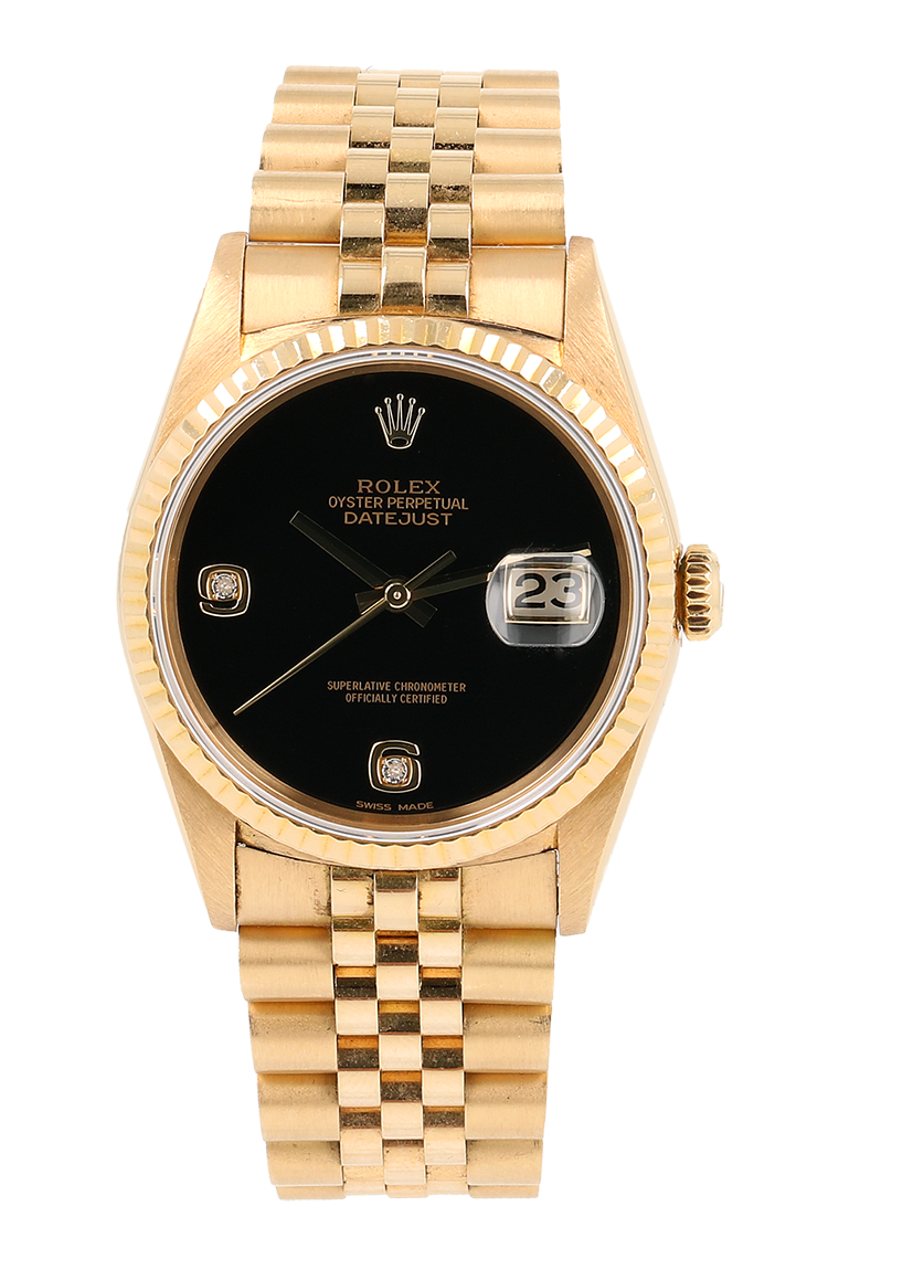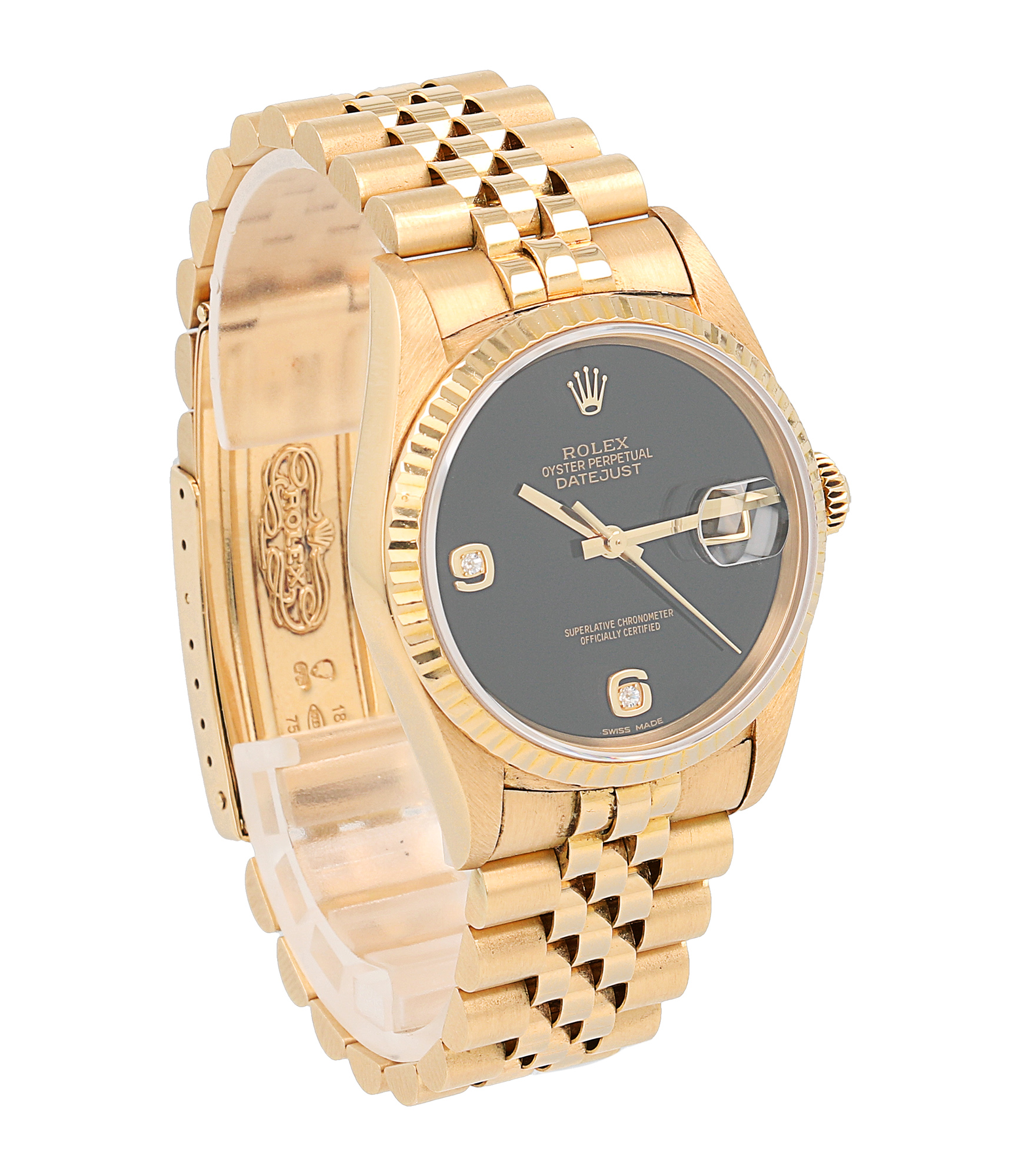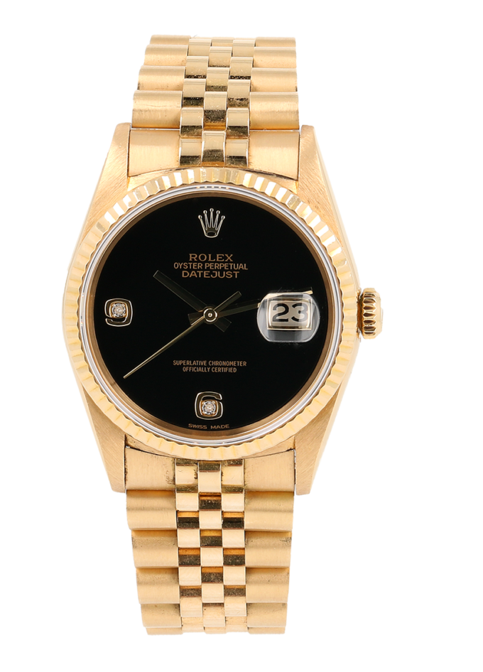 Rolex Datejust in oro giallo, referenza 16238, quadrante in pietra Onice con diamanti applicati ad ore 6 e 9 e data ad ore 3, fondello e corona a vite, movimento meccanico a carica automatica. seriale L, anno 1989. 36mm.