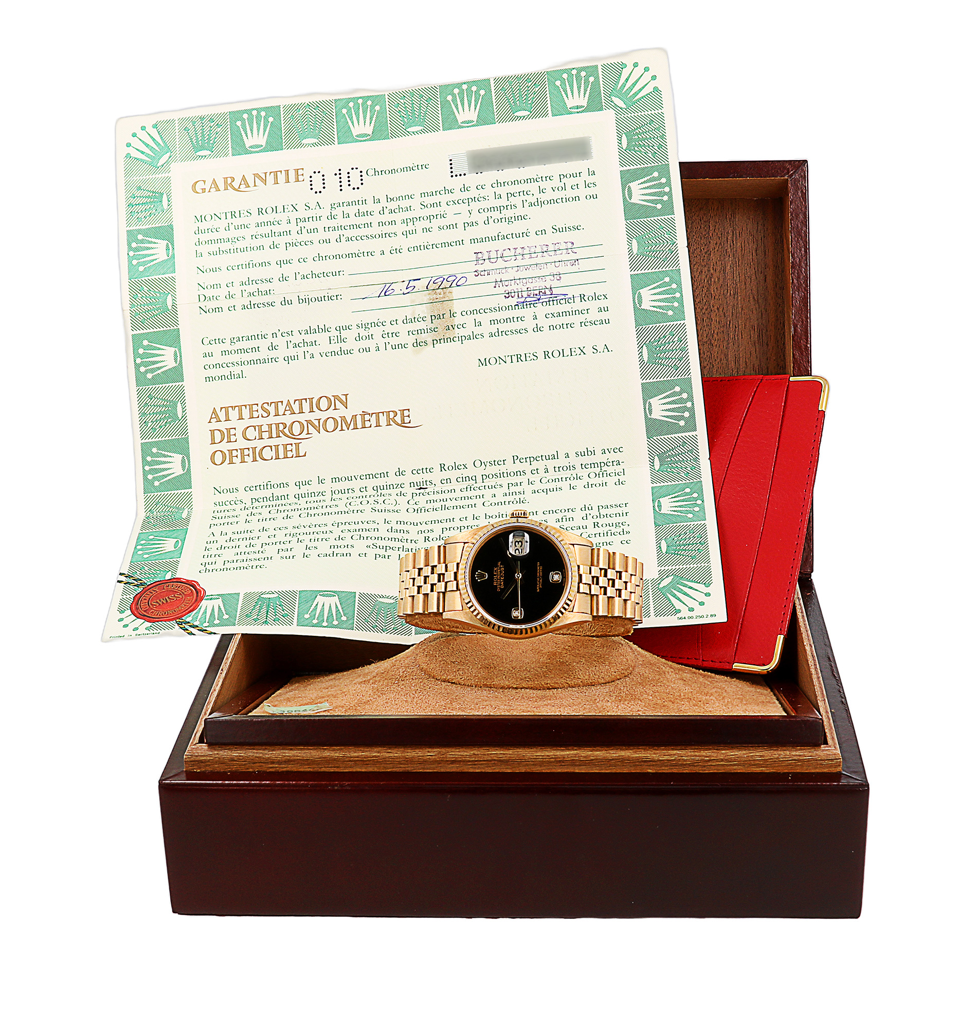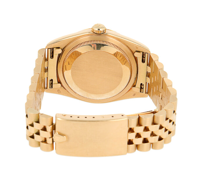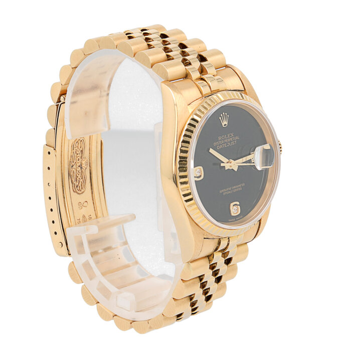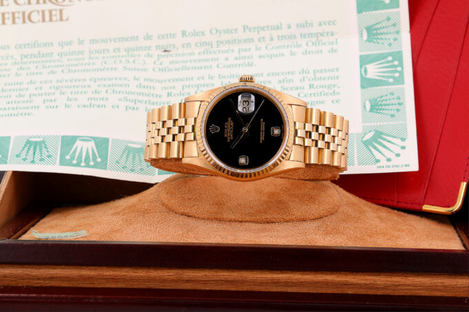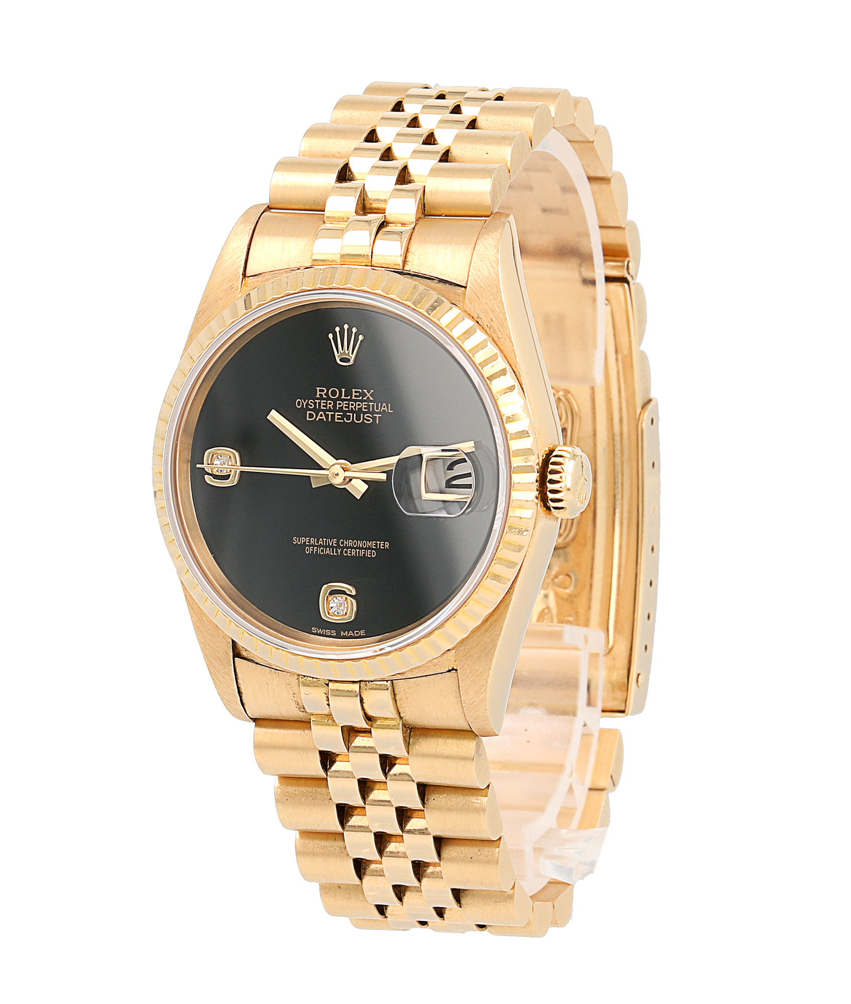Rolex Datejust in oro giallo, referenza 16238, quadrante in pietra Onice con diamanti applicati ad ore 6 e 9 e data ad ore 3, fondello e corona a vite, movimento meccanico a carica automatica. seriale L, anno 1989. 36mm.
