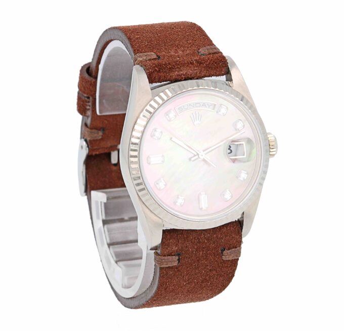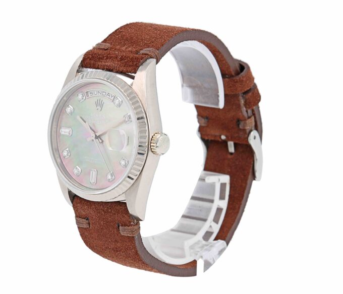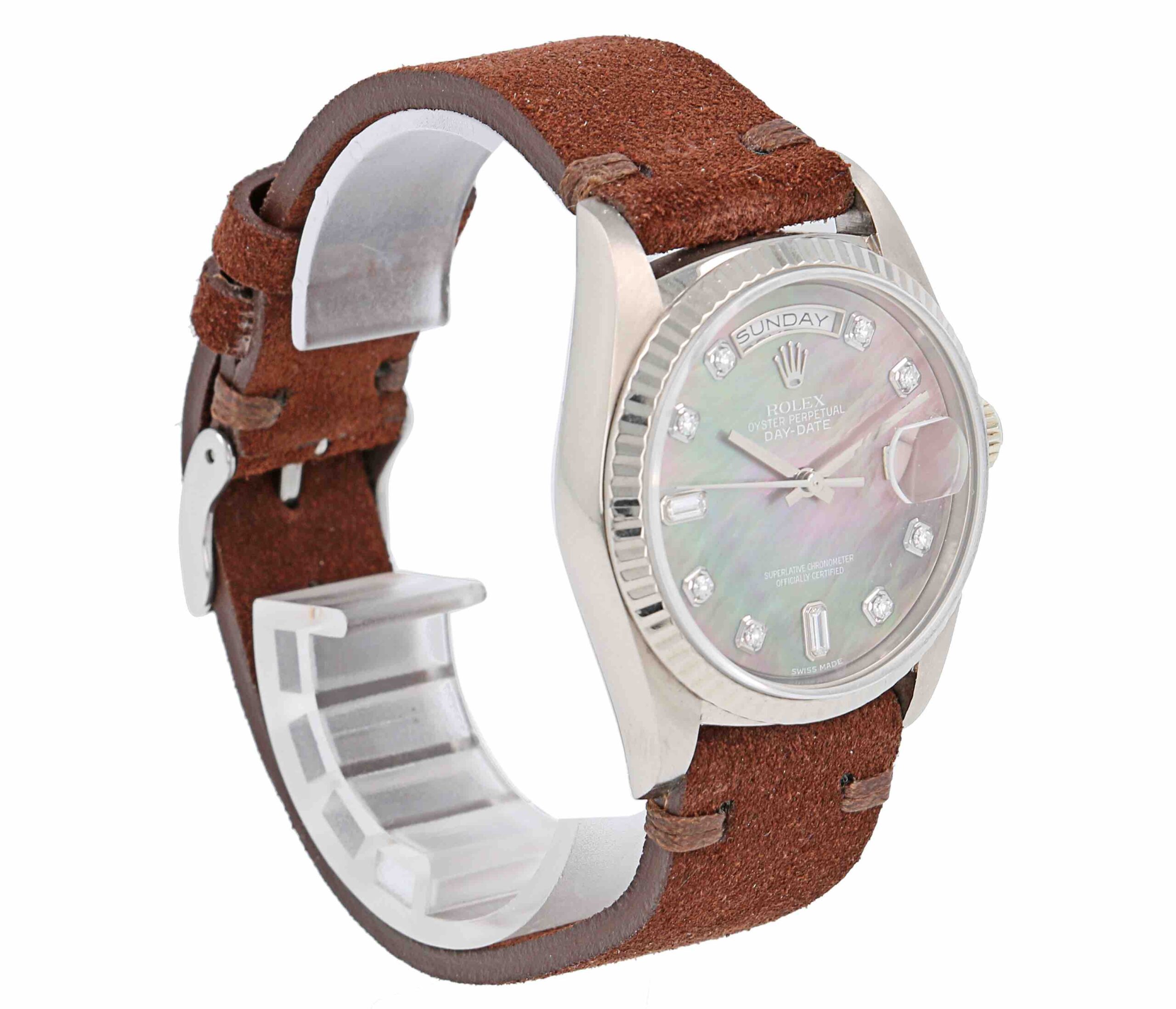 RolexRolex Oyster Perpetual Day-Date in oro bianco, referenza 18239, quadrante madreperla scura “Tahitian” con indici in diamanti e data ad ore 3 e giorno ad ore 12, fondello e corona a vite, movimento meccanico a carica automatica. Seriale L7, anno 1990.