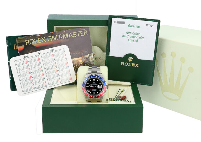 Rolex Gmt-Master II in Acciaio, referenza 16710, quadrante Nero con indici applicati, Ghiera Bicolore Rossa e Blu (Pepsi), fondello e corona a vite, movimento a carica automatica, completo di scatola, garanzia svizzera. Anno 2006.