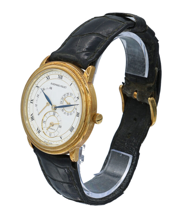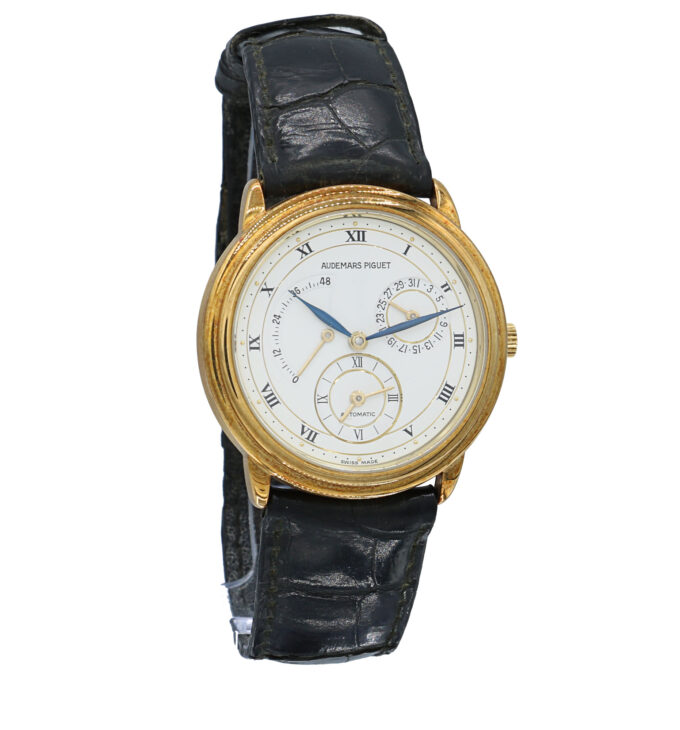 EnquiryAudemars Piguet Dual Time GMT Power Reserve in yellow gold, reference 25685BA, white dial with Roman indexes, mechanical movement with automatic winding. 1990s, with certificate of origin.