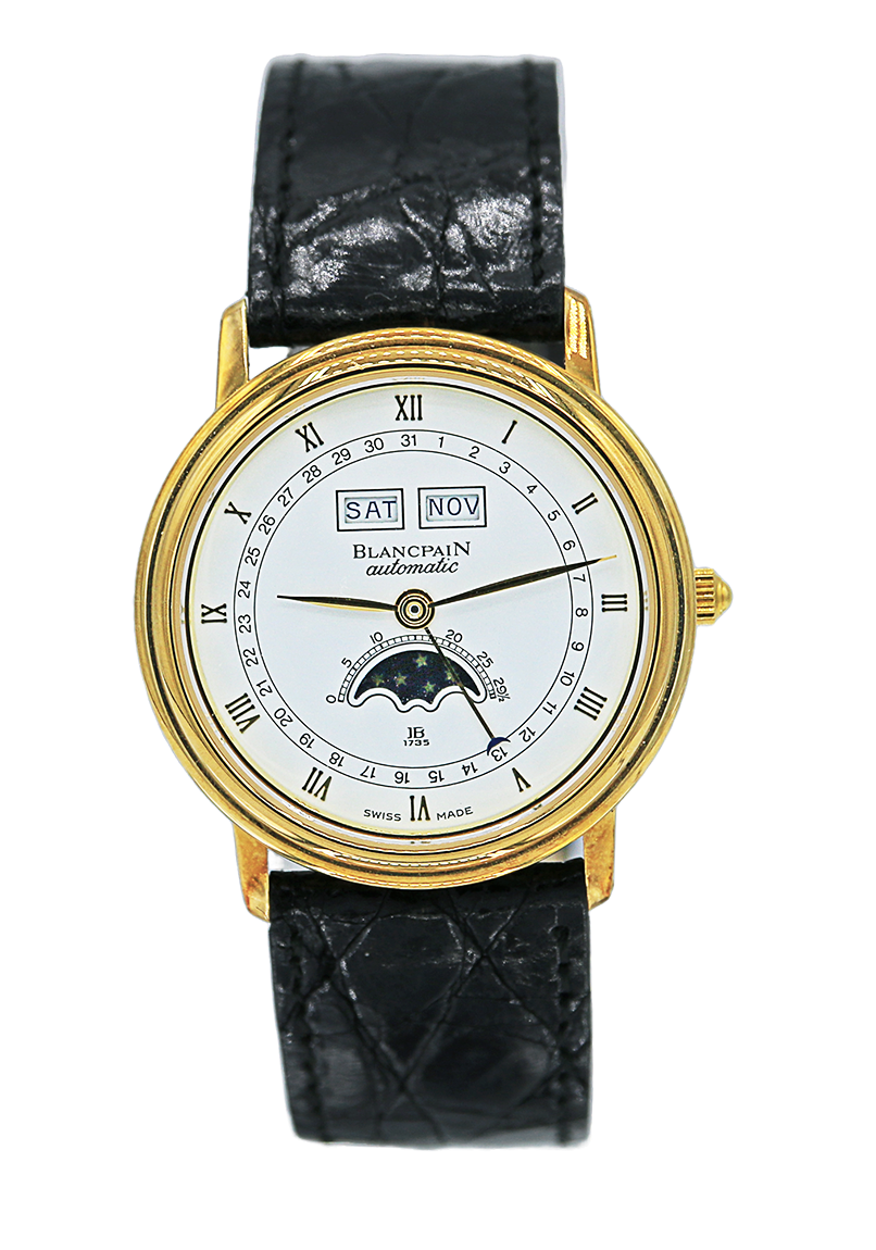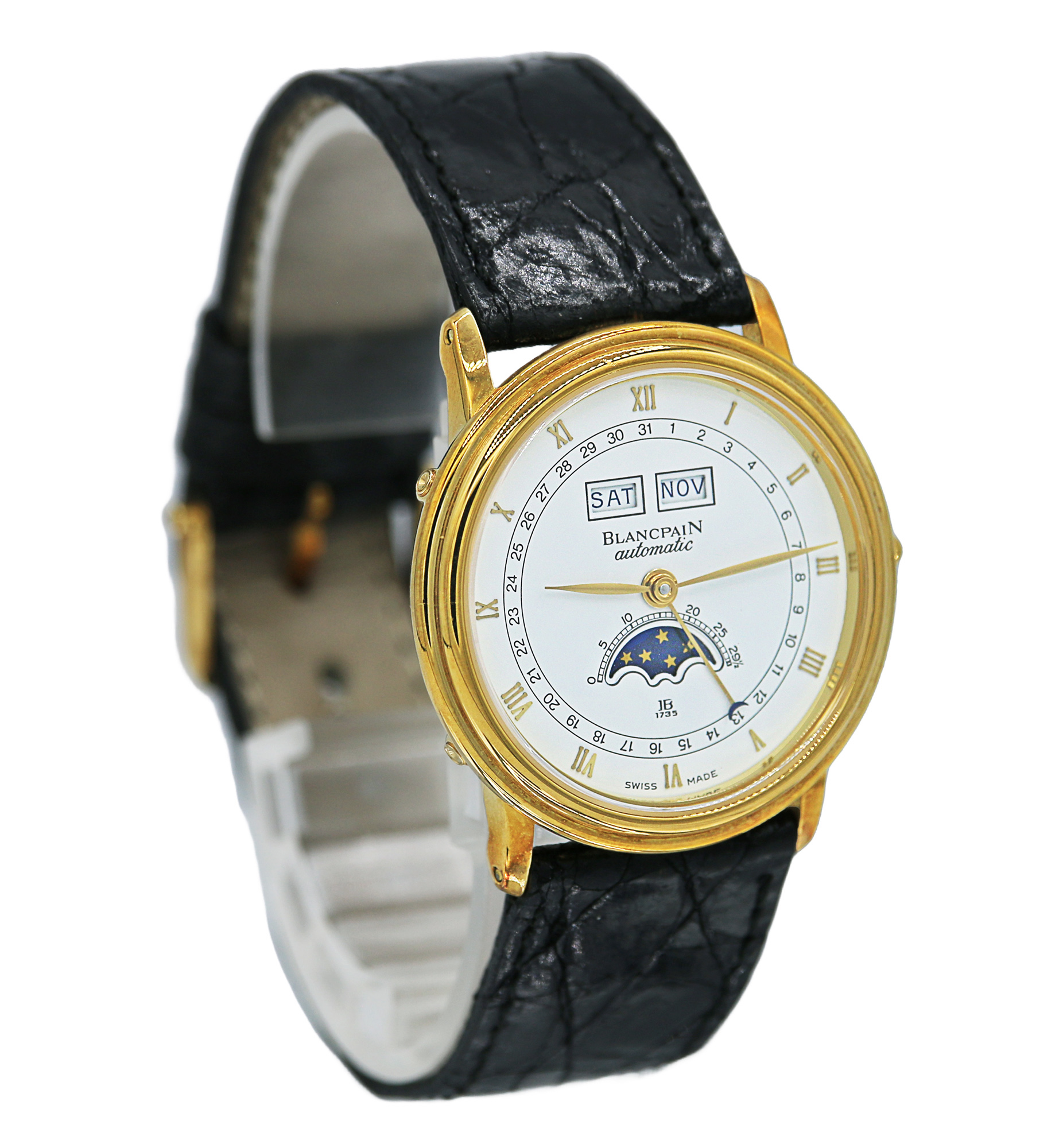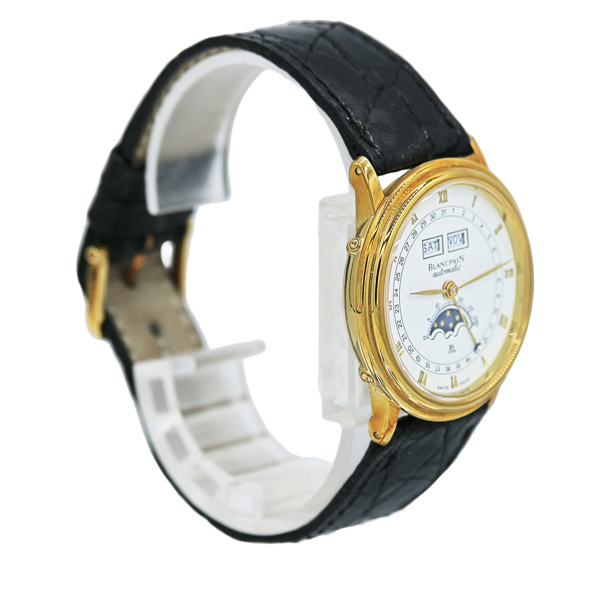 BlancpainBlancpain Villeret Moon Phase Triple Calendar in Yellow Gold, reference 6595, white dial with applied Roman indexes, moon phases at 6 o’clock, day and month at 12 o’clock, date indicated by an additional hand, pressure-fit caseback and crown, self-winding movement . 90’s. 34mm