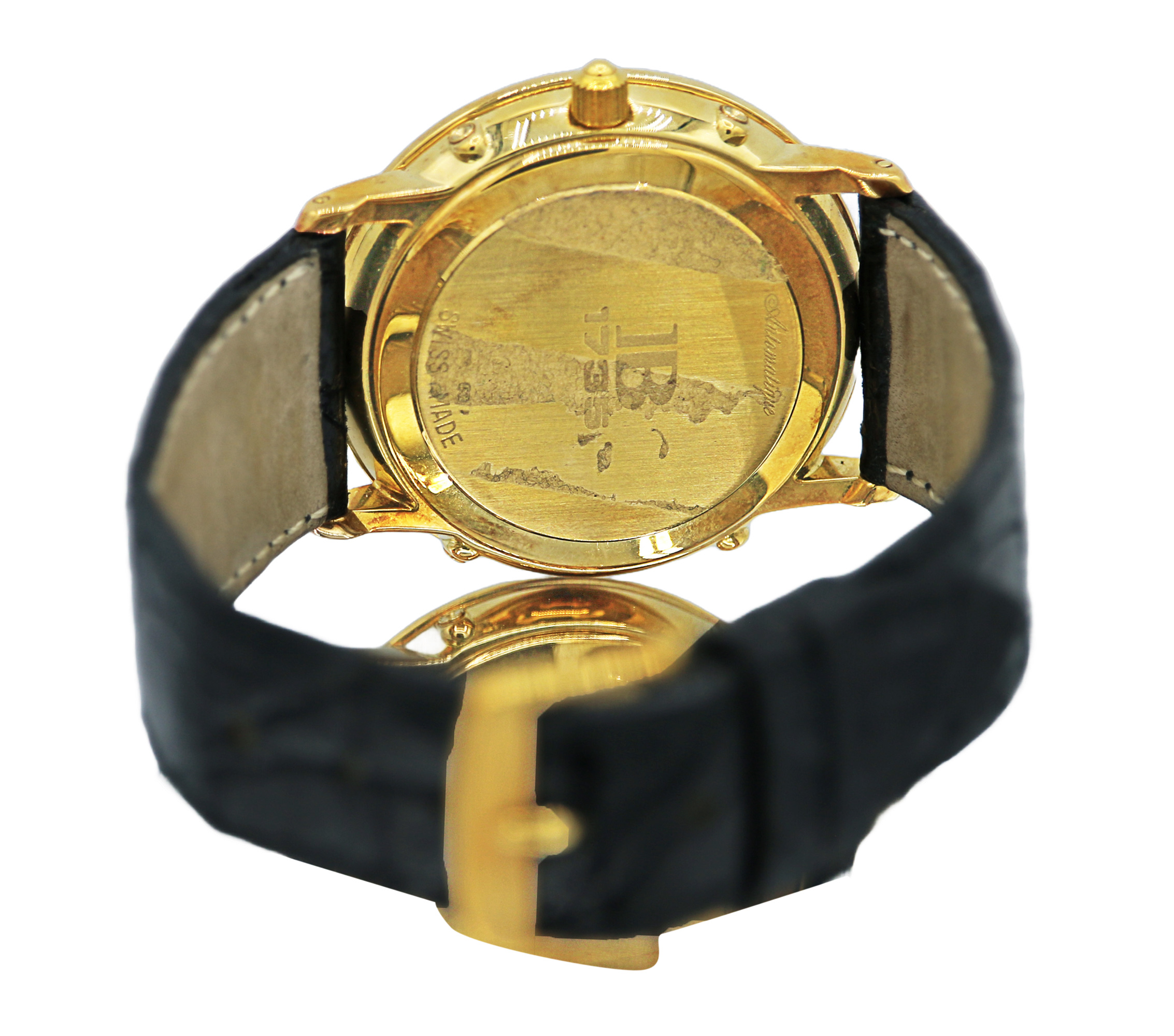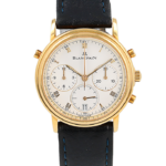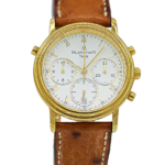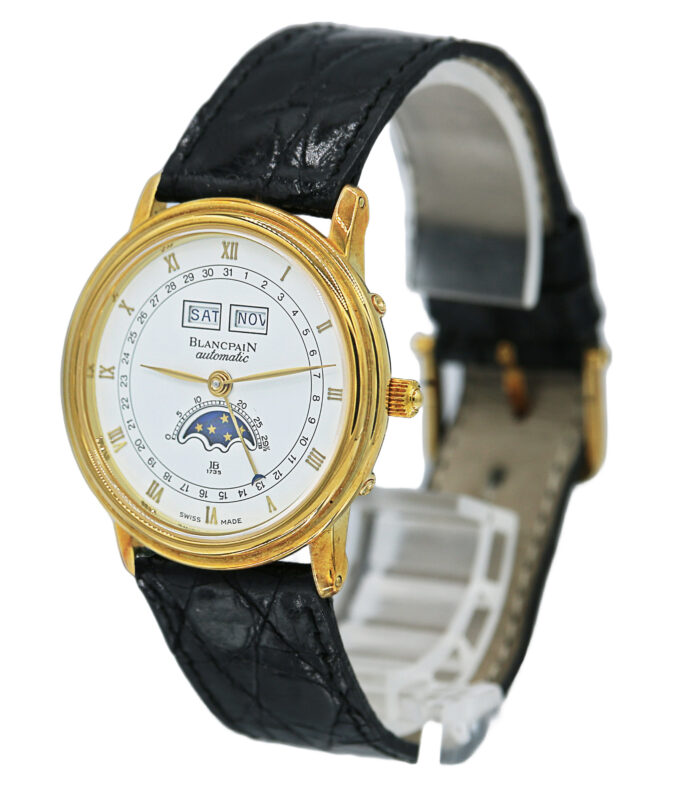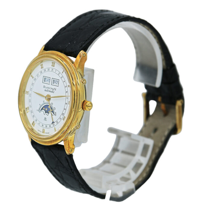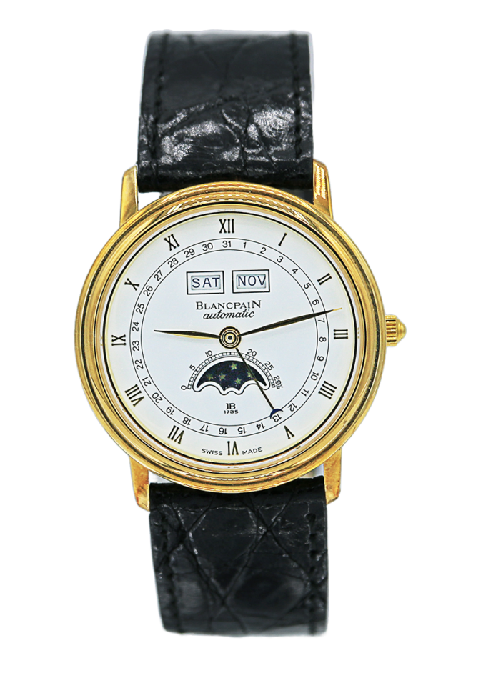 BlancpainBlancpain Villeret Moon Phase Triple Calendar in Yellow Gold, reference 6595, white dial with applied Roman indexes, moon phases at 6 o’clock, day and month at 12 o’clock, date indicated by an additional hand, pressure-fit caseback and crown, self-winding movement . 90’s. 34mm