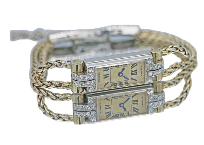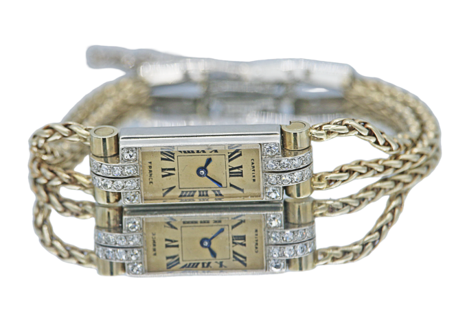 Very rare Cartier France ladies’ miniature rectangular shape in platinum, case set with diamonds, clearly visible platinum hallmarks, white gold bracelet, manual duo plan movement, 1930s.