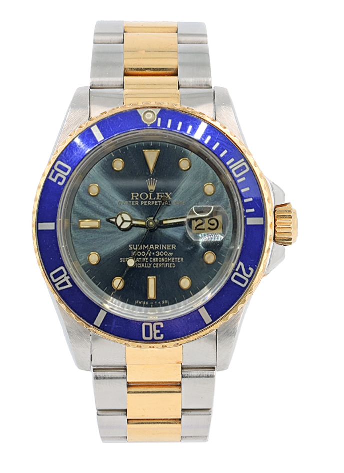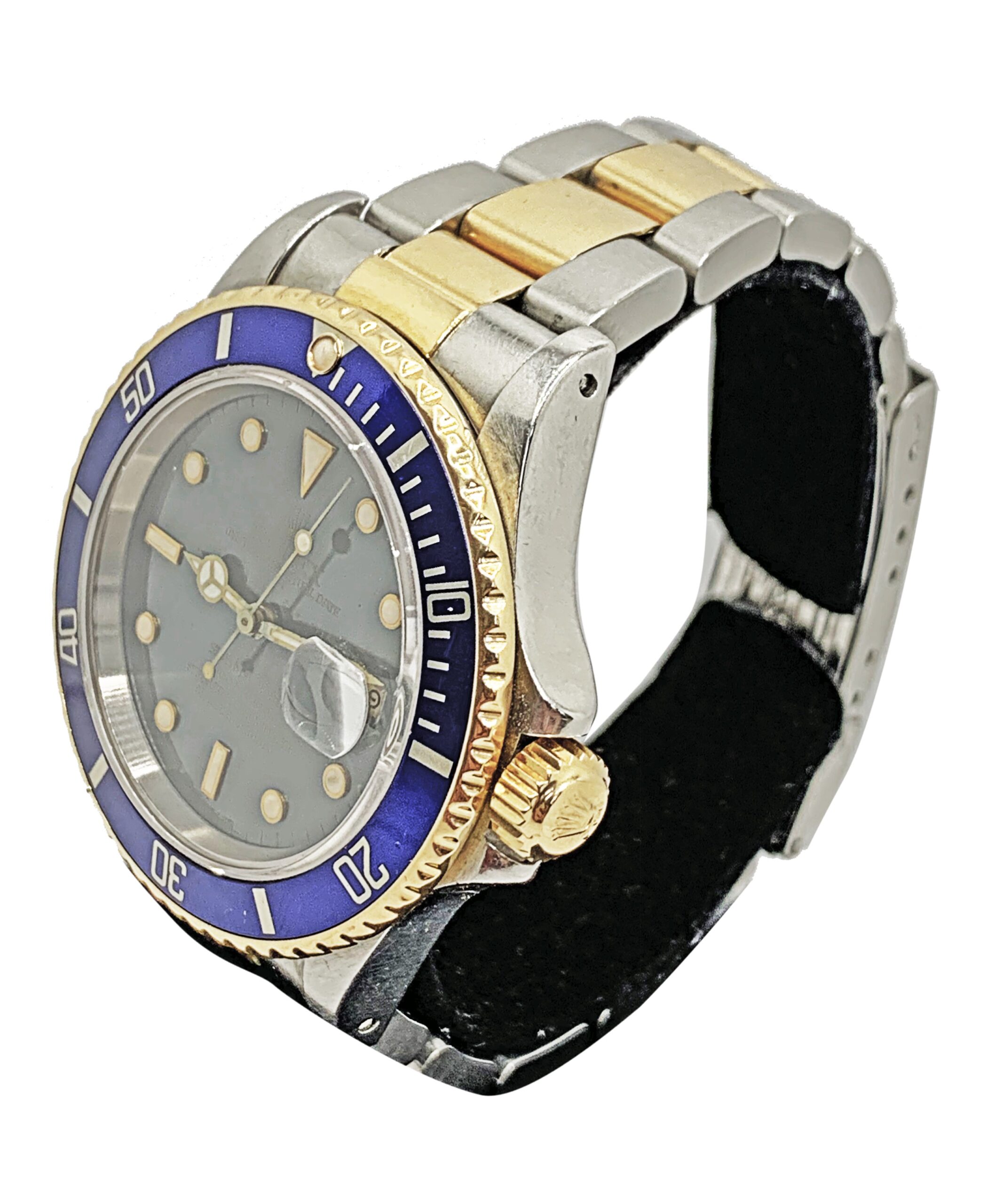 Rolex Submariner Date in Steel and Yellow Gold, reference 16803, blue bezel, blue dial with applied indexes and date at 3 o’clock, screw-down caseback and crown, self-winding mechanical movement. This is a Transitional Submariner model, produced from 1984 to 1987. Very good condition of the Watch. 1987.