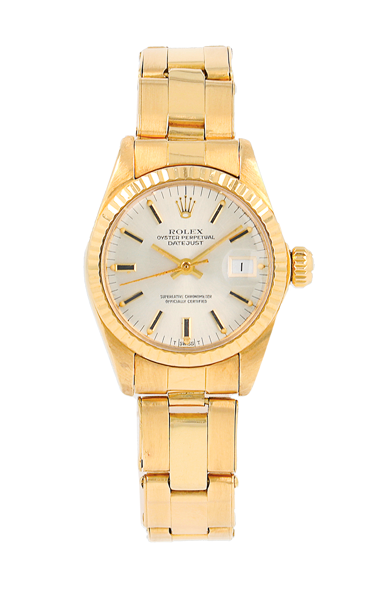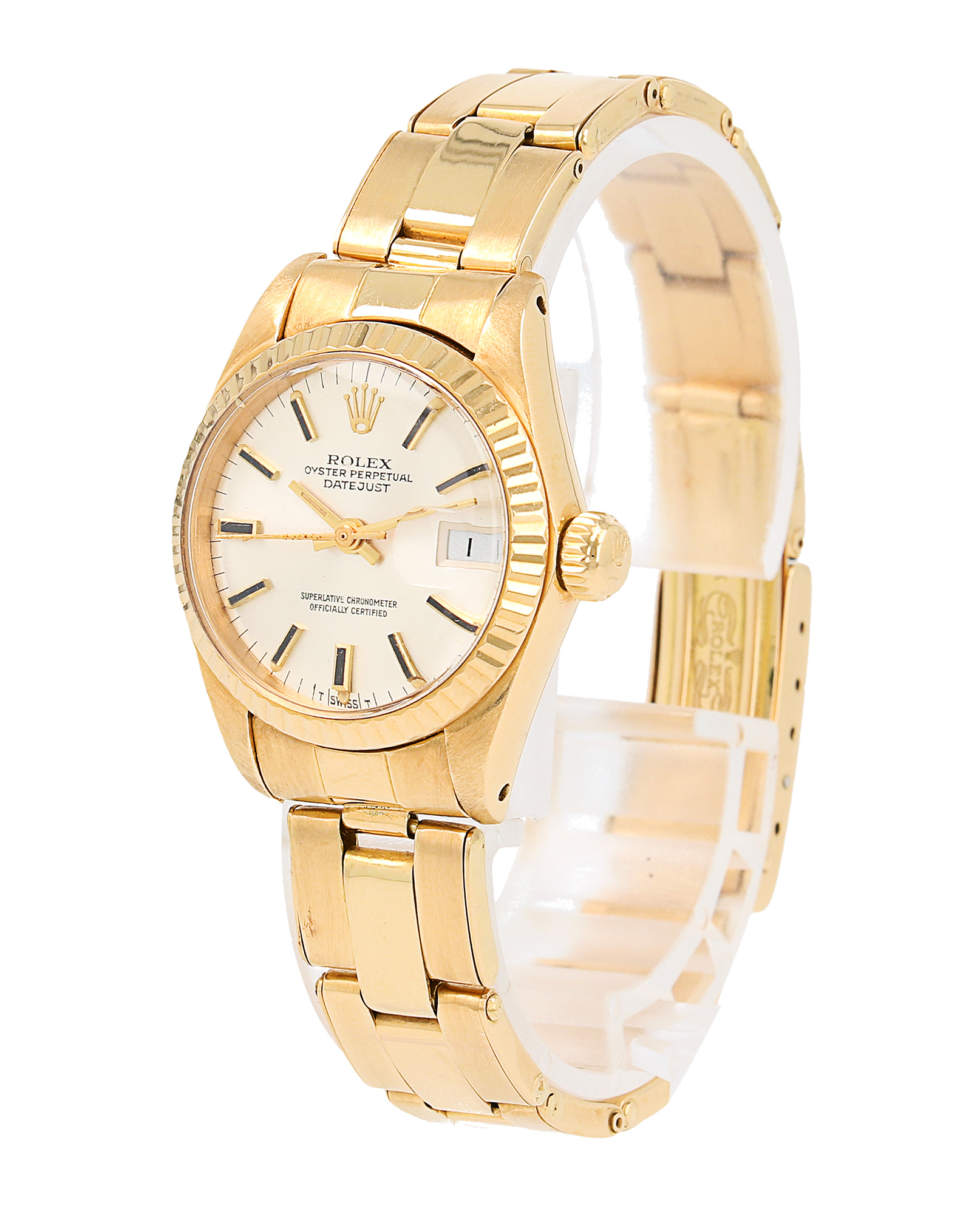 RolexRolex Datejust Lady in Yellow Gold ref. 6917, Oyster case with screw crown and caseback, silver dial in perfect condition, automatic movement, year 1980. Riveted Rolex bracelet in yellow gold and original box. Used very little as per the engravings still visible on the “Registered Design” case back. 26mm.