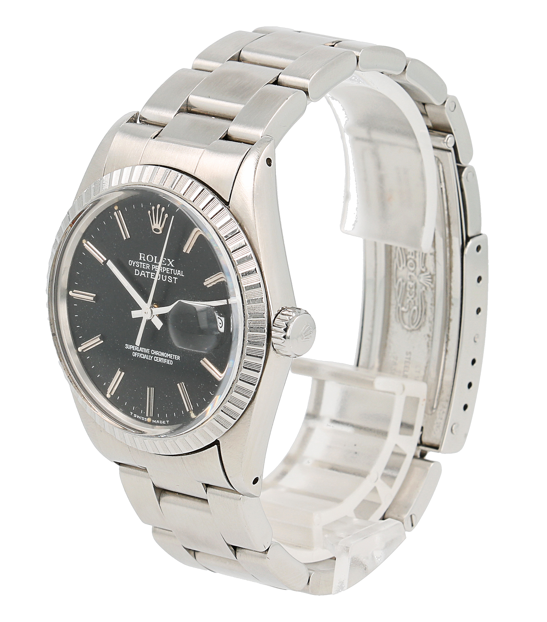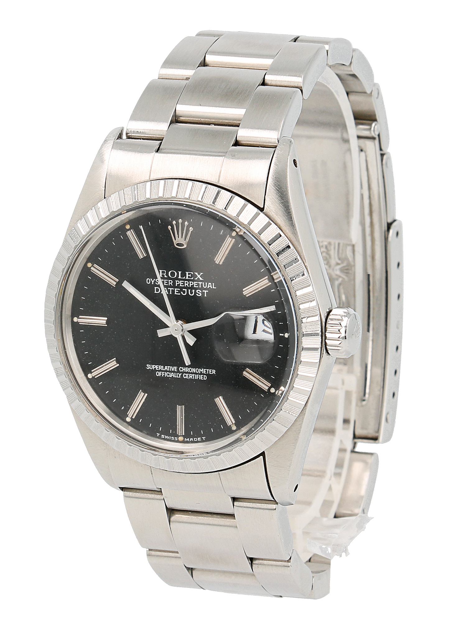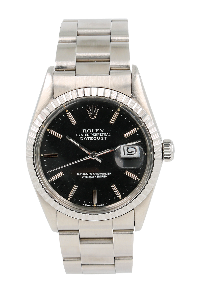 RolexRolex Datejust in steel, reference 16030, black dial with applied indexes, date window with Cyclops lens, automatic movement, original steel Oyster bracelet with Rolex clasp. Sapphire crystal and reeded steel bezel. A timeless Rolex classic, elegant and sporty at the same time. 1980s.
