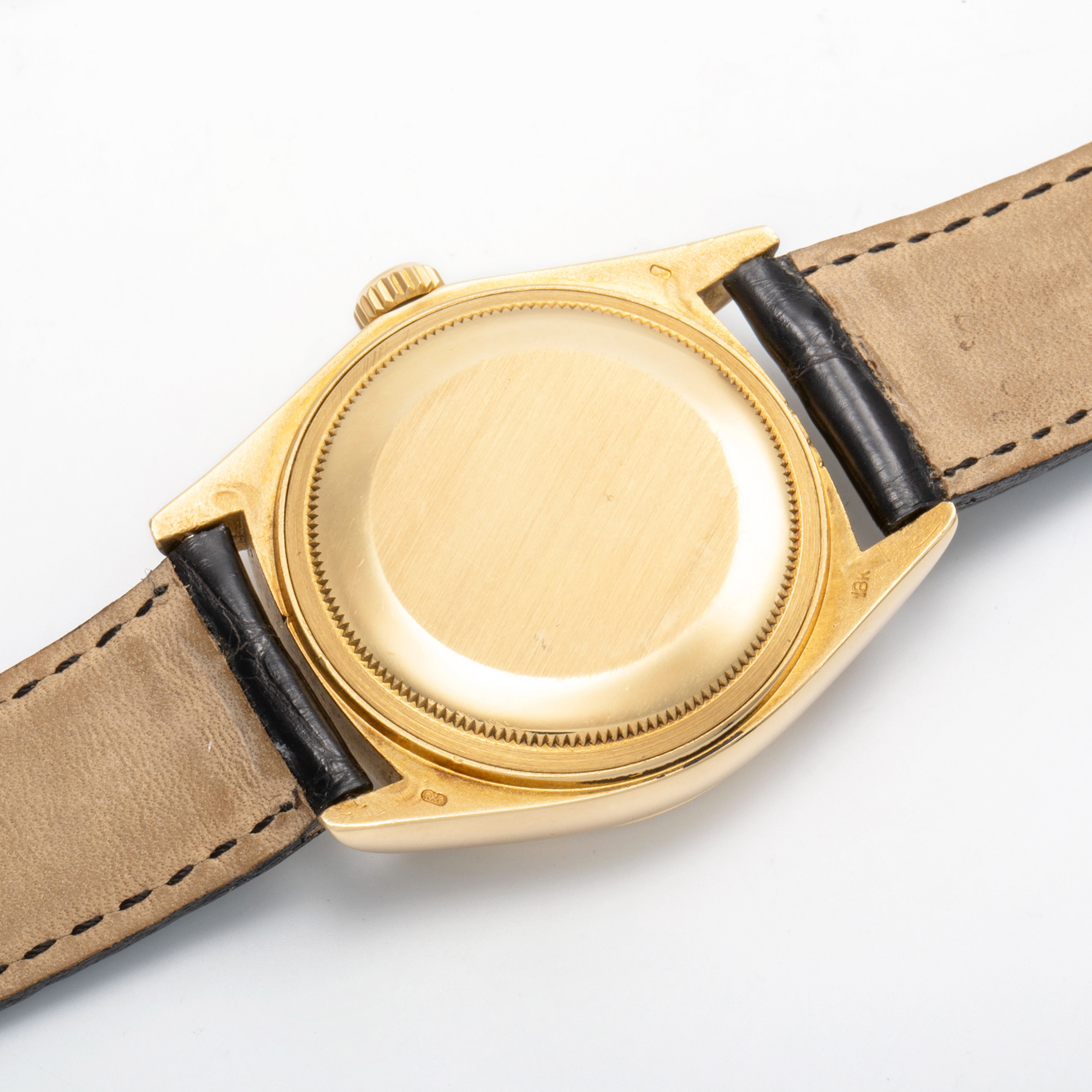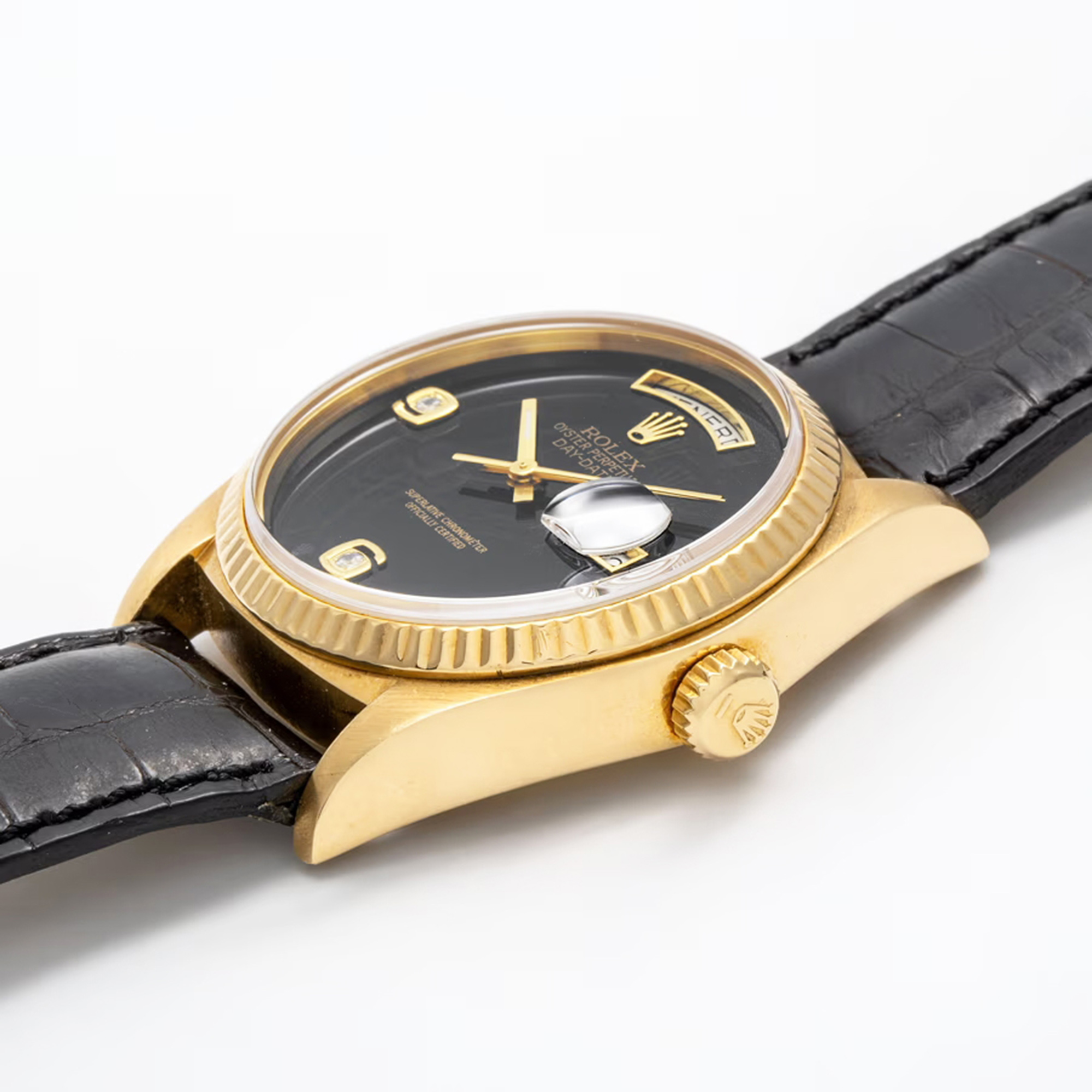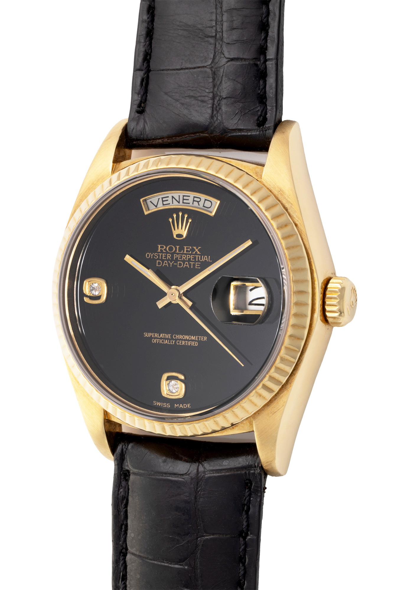 RolexRolex Day-Date in yellow gold, reference 18038, onyx dial with applied diamonds at 6 and 9 o’clock, date at 3 o’clock and day at 12 o’clock, screw-down case back and crown, self-winding mechanical movement. Serial number 6.7M, year 1981. 36 mm.