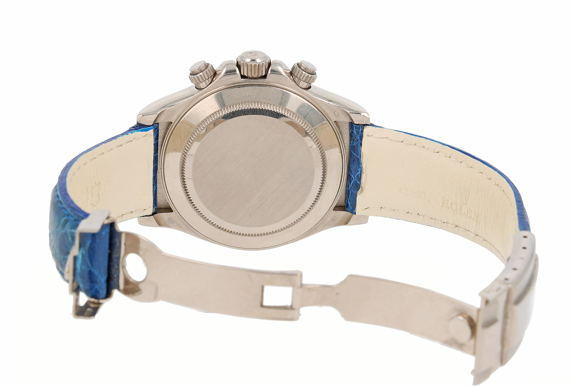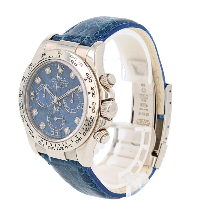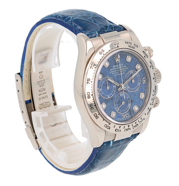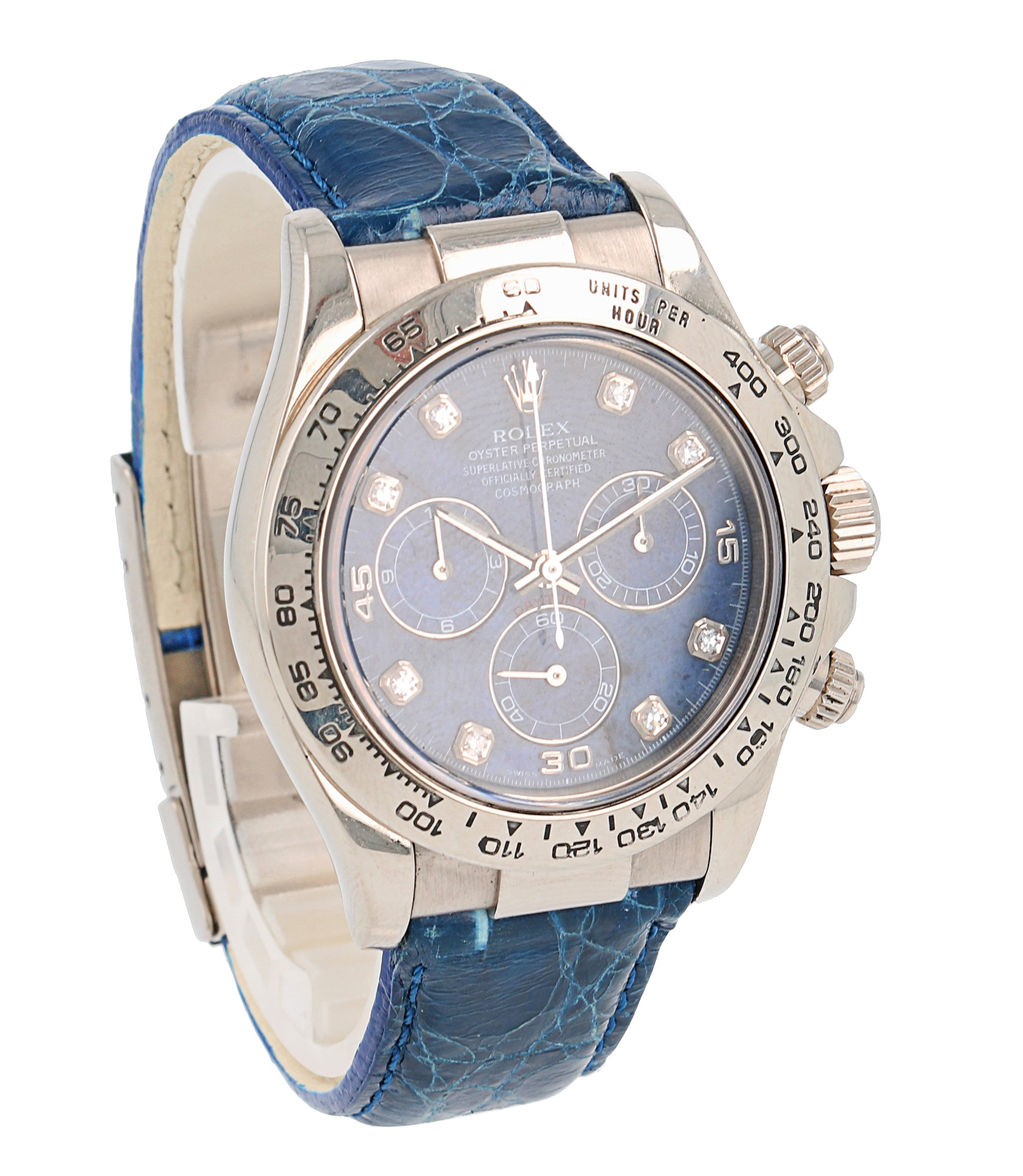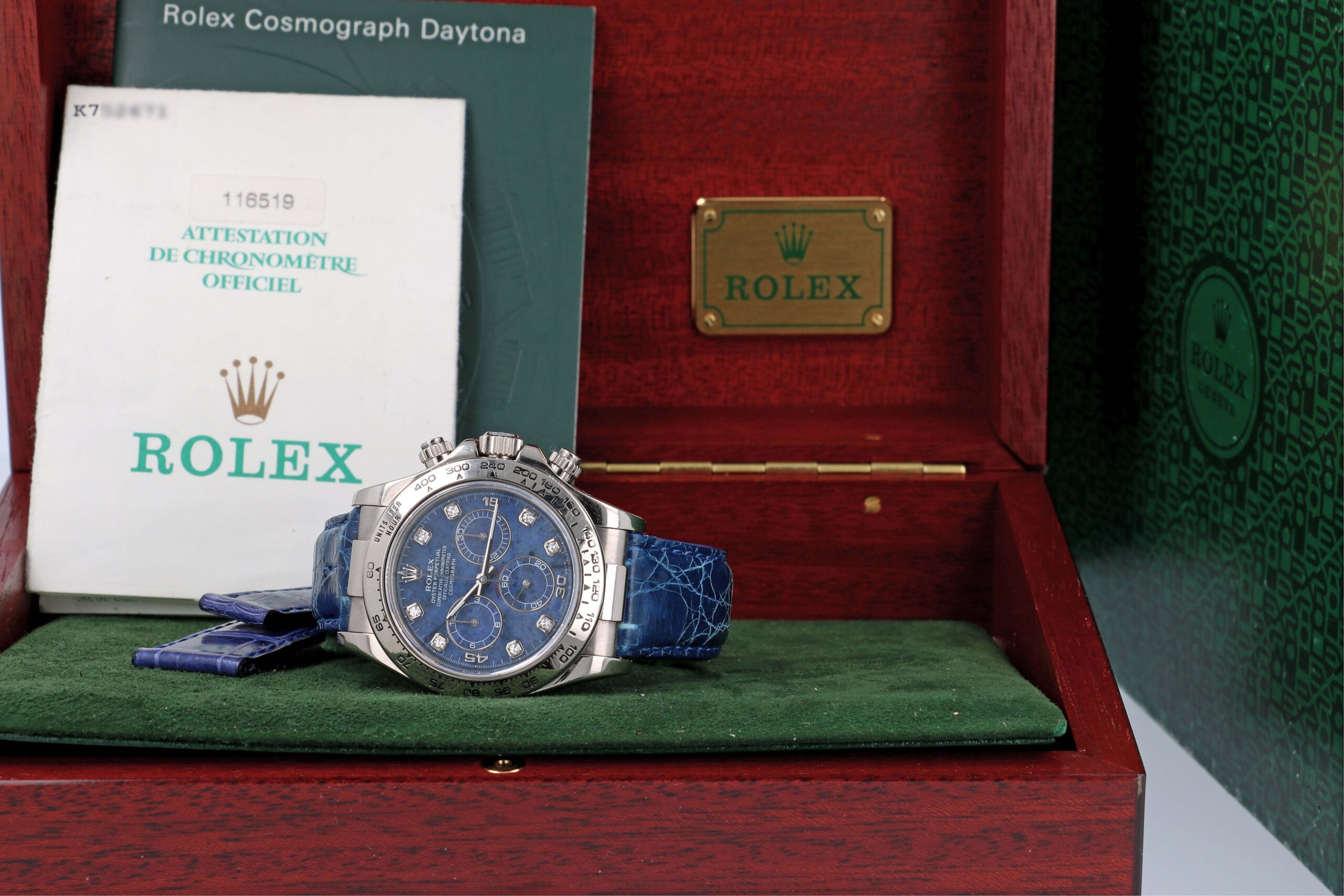 Rolex Daytona in White Gold, reference 116519, Sodalite dial with applied diamond-set indexes, screw-down caseback and crown, self-winding mechanical movement. Complete with box and guarantee. 2000s.