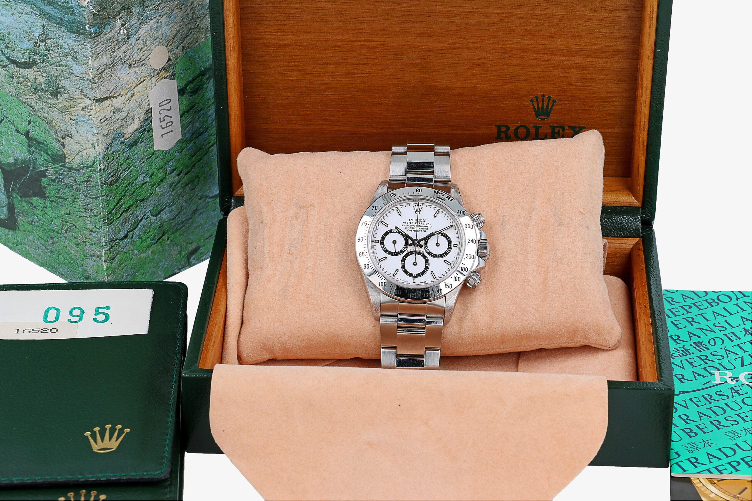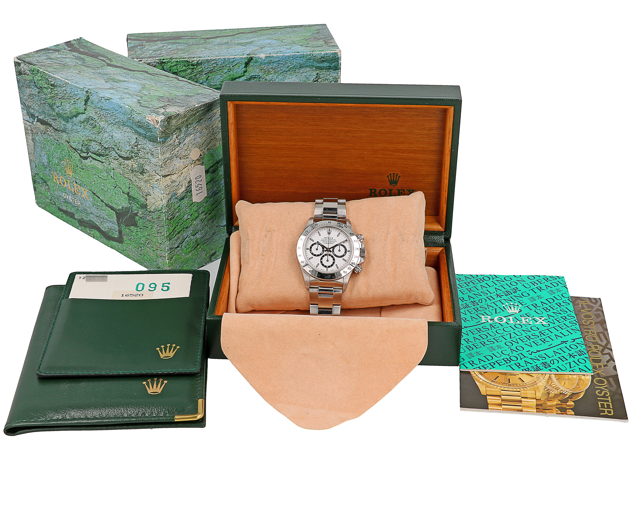 RolexRolex Cosmograph Daytona in steel, reference 16520, white dial with applied indexes, screw-down case back, pushers and crown, automatic movement Zenith El Primero 4030. Watch in excellent overall condition. Serial T2, year 1996, complete with box, guarantee and period booklets.