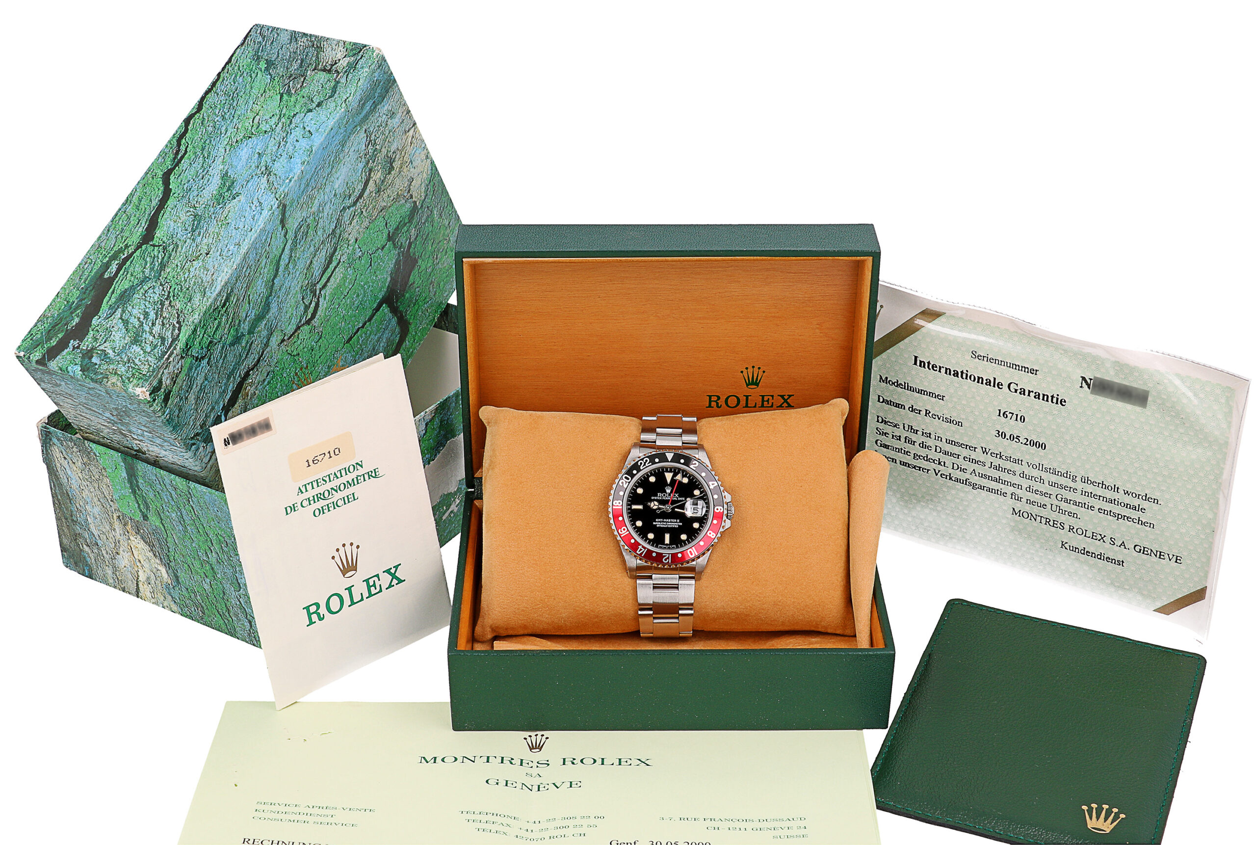 RolexRolex GMT-Master II in steel, reference 16710 with the iconic red/black “Coke” bezel. The black dial offers great readability, with luminous indexes and a red GMT hand for displaying the second time zone. Equipped with an automatic movement with GMT function, sapphire crystal, and a stainless steel Oyster bracelet. Serial number N3 from 1992, complete with original box, warranty, and Rolex service documentation performed in 2000 (official Rolex letter).