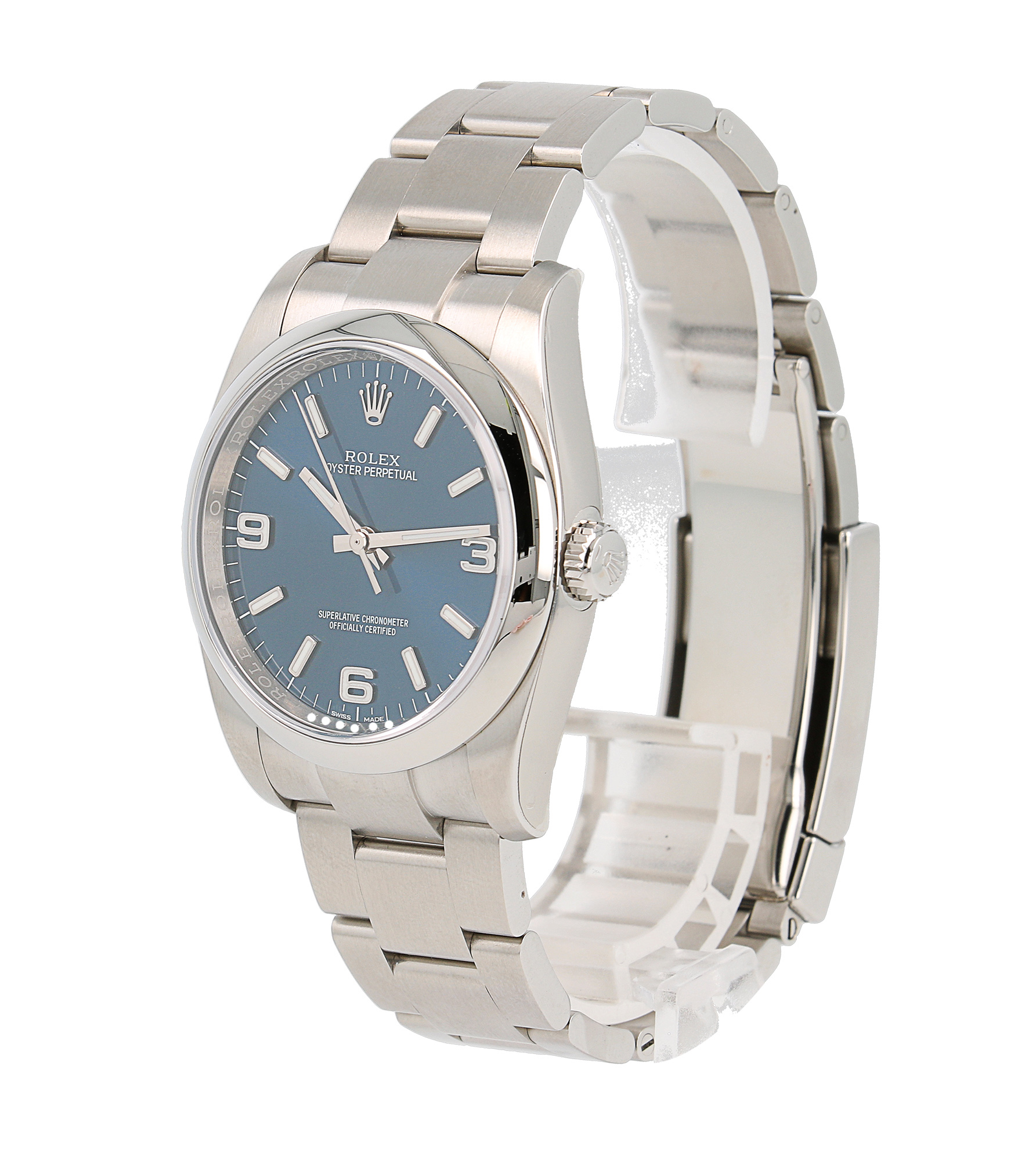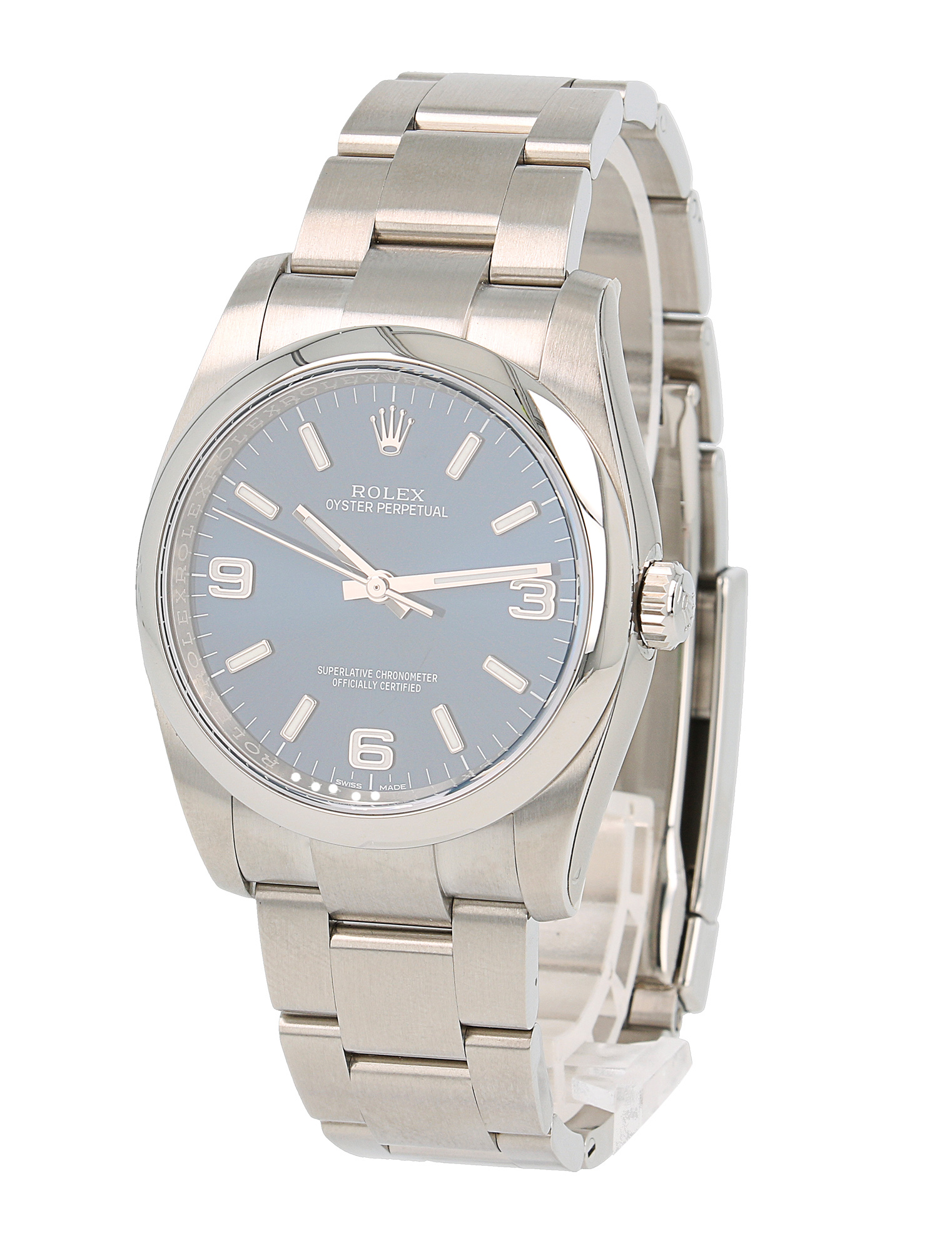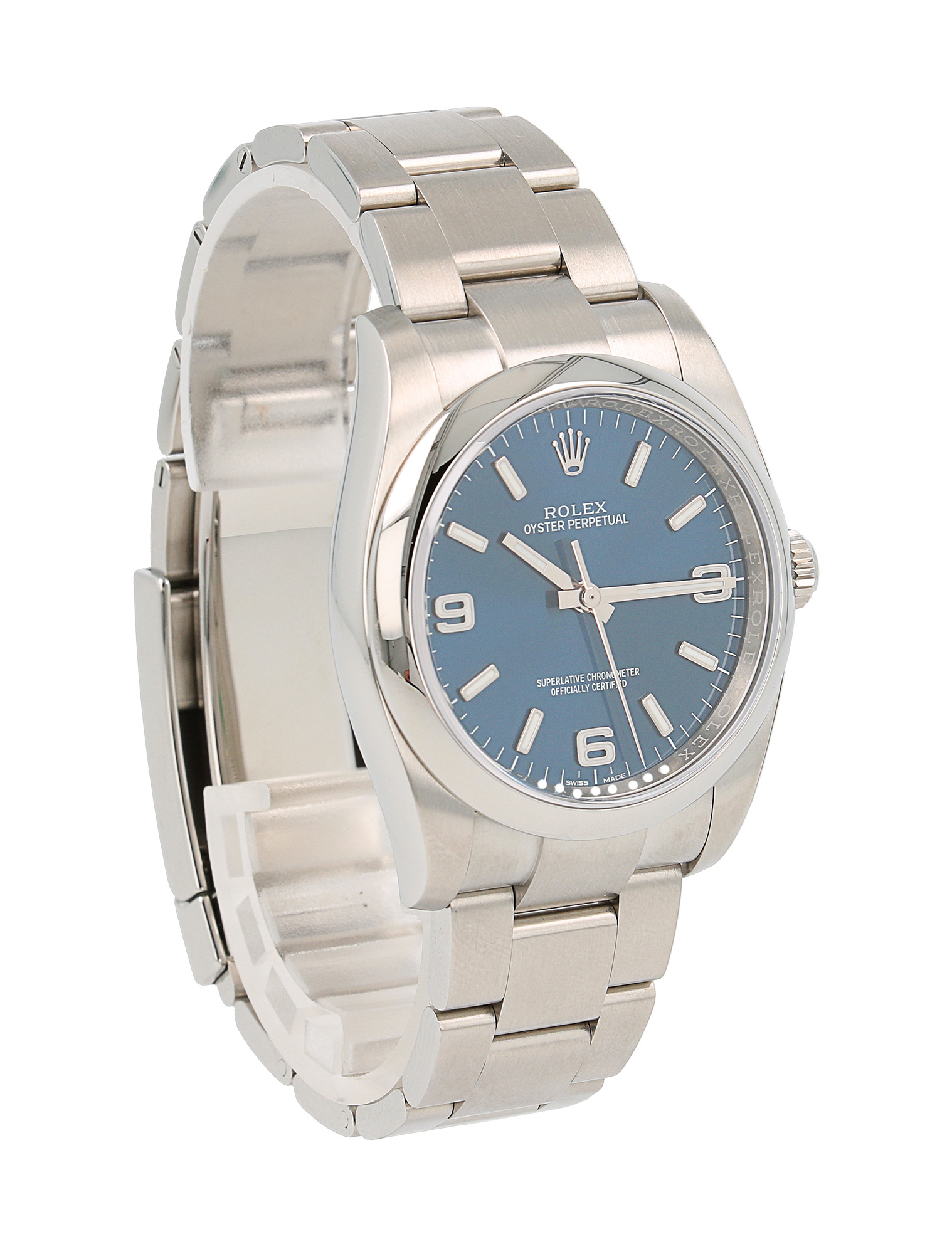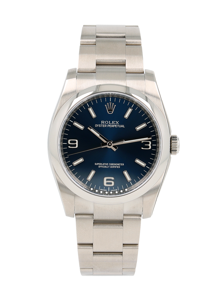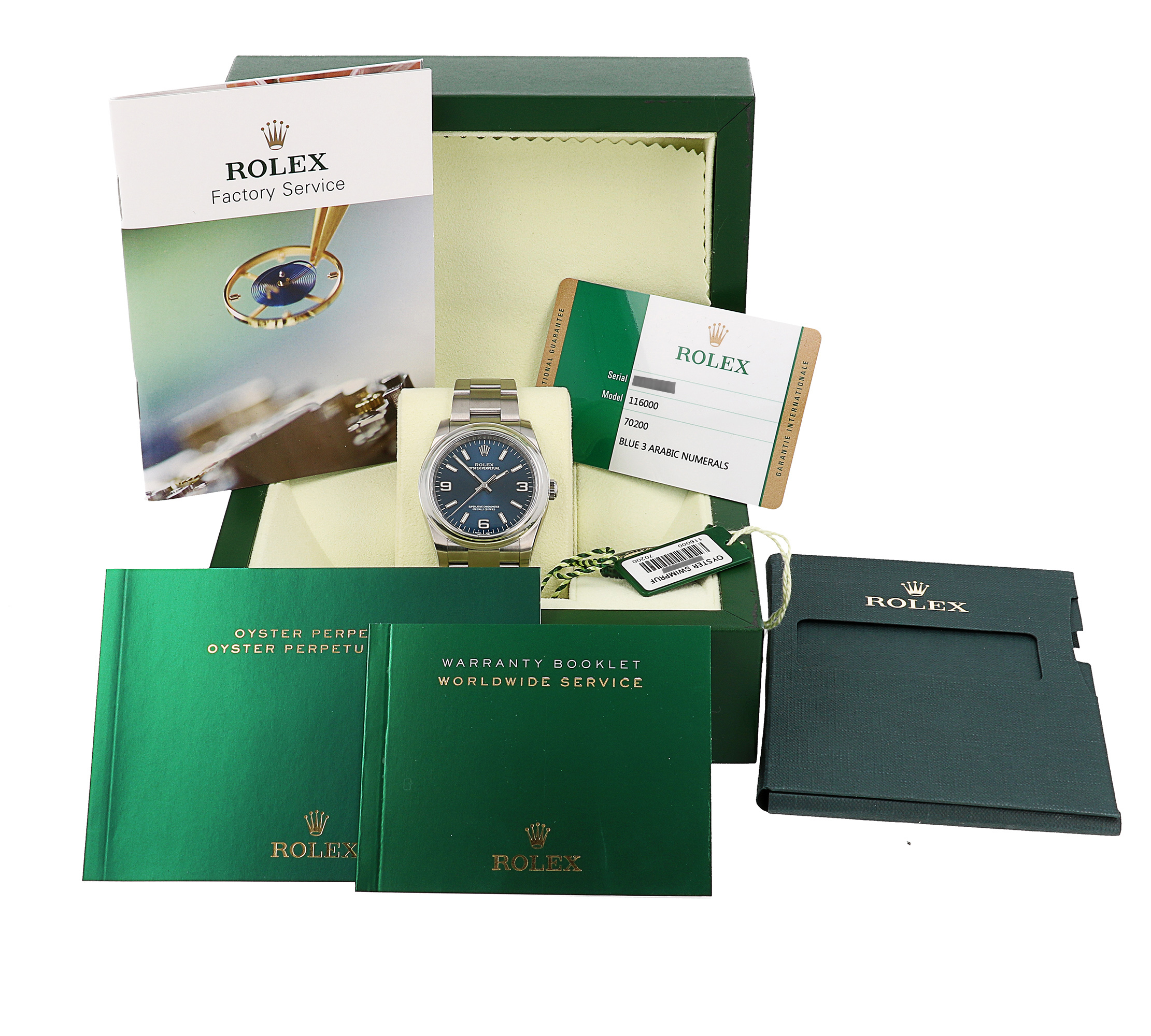 RolexRolex Oyster Perpetual in steel, reference 116000, Blue dial with applied indexes, case back engraved with the Hendrick Motorsports 20 Years logo, screw-down crown, mechanical self-winding movement. Years 2015, with box and warranty.